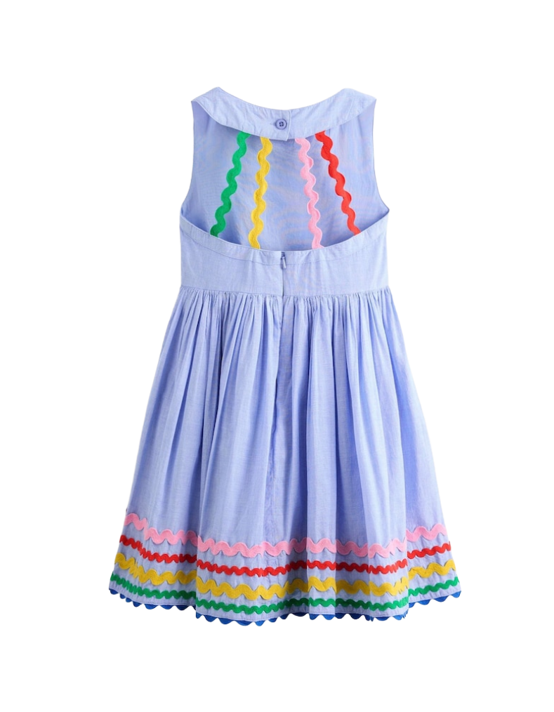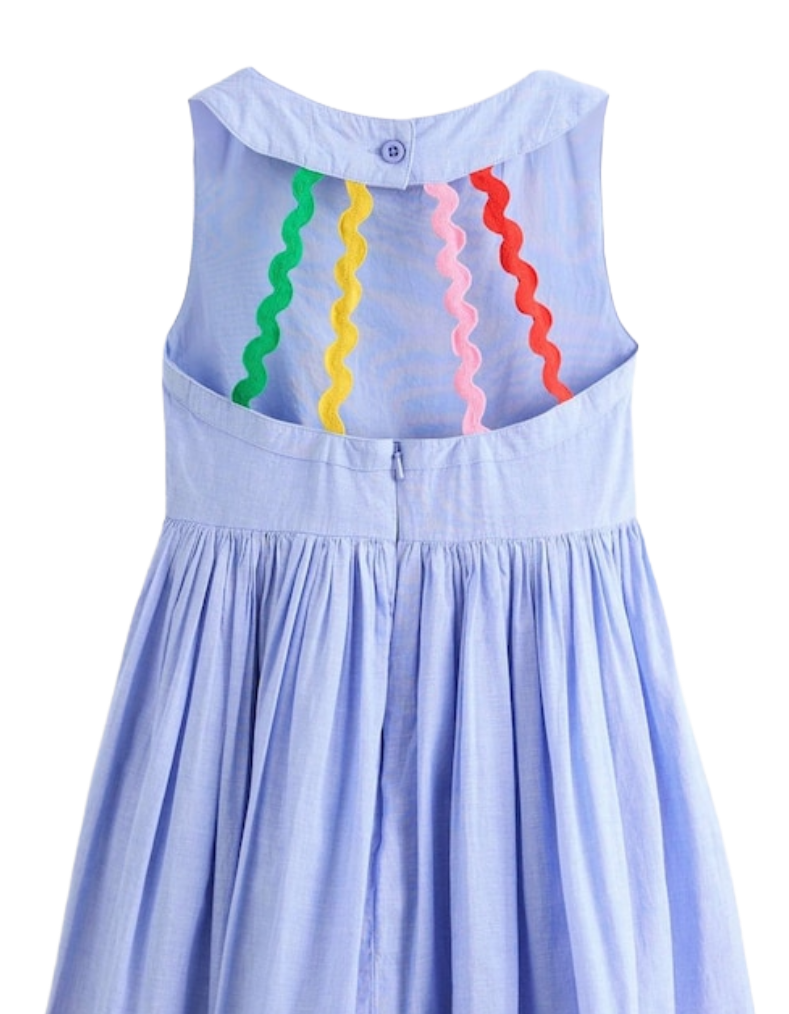 Designed for adventures down winding lanes or along new coastlines, the Harlow dress features a fitted bodice with back straps and a full, flowing skirt that swishes with every step. The sleeveless silhouette offers freedom of movement, while the vibrant blue and multi-coloured palette brings playful energy to any occasion. Perfect for exploring, whether she's discovering hidden gardens or seaside treasures, this dress combines practical comfort with charming style that grows with her wardrobe.
