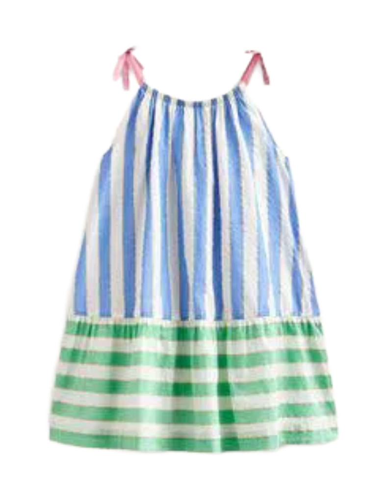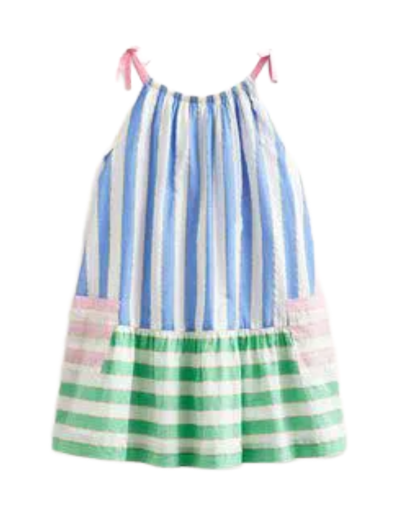 This Mini Boden dress features a charming mix of seaside-inspired stripes with securely fixed bows on the straps, ensuring style without fuss. The elasticated neckline offers a comfortable, tailored fit, while the 100% cotton main fabric and lining guarantee softness and breathability, making it ideal for active girls.