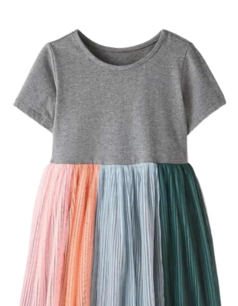 Crafted from a soft blend of 95% cotton and 5% spandex jersey, the bodice and underskirt of this dress offer gentle stretch and comfort. The poly pleated tulle overlay adds a delicate, textured layer, enhancing its full sweep silhouette. Designed with an above-knee length, this dress combines playful charm with ease of movement, making it ideal for everyday wear or special occasions.