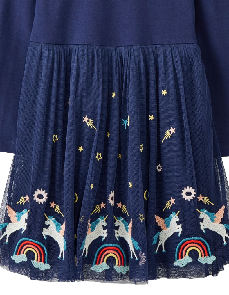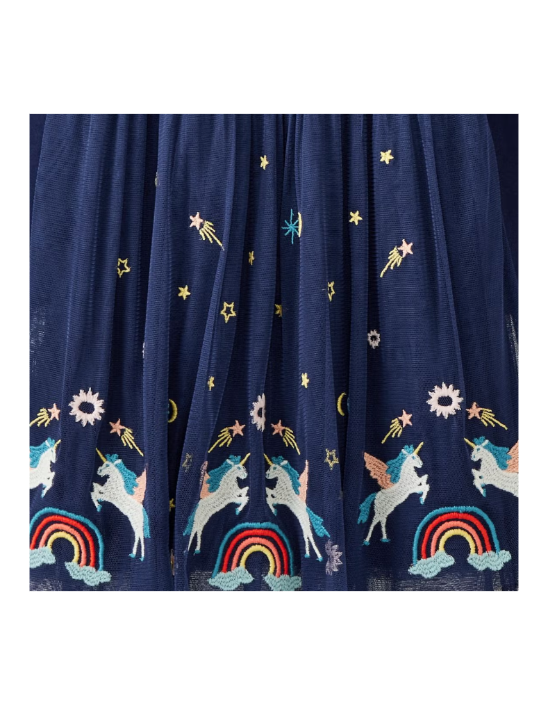 Crafted with delicate embroidered details, the Hanna Andersson Long Sleeve Embroidered Tulle Skater Dress in Navy Unicorn combines elegance and comfort. Its long sleeves provide warmth while the soft tulle fabric offers a graceful silhouette, perfect for special occasions. The navy base adorned with whimsical unicorn embroidery creates a unique look that stands out. This dress balances playful charm with refined style, ideal for layering or wearing on its own.
