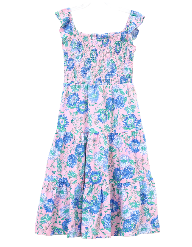 This Lilly Pulitzer Girls' Mini Jilly Tiered Midi Dress in Conch Shell Pink features a flattering square neckline and delicate short flutter sleeves for a playful, breezy look. The smocked front and back provide a comfortable, flexible fit, while the all-over print adds vibrant charm. Its tiered design creates graceful movement, making it an ideal choice for special occasions or everyday wear.