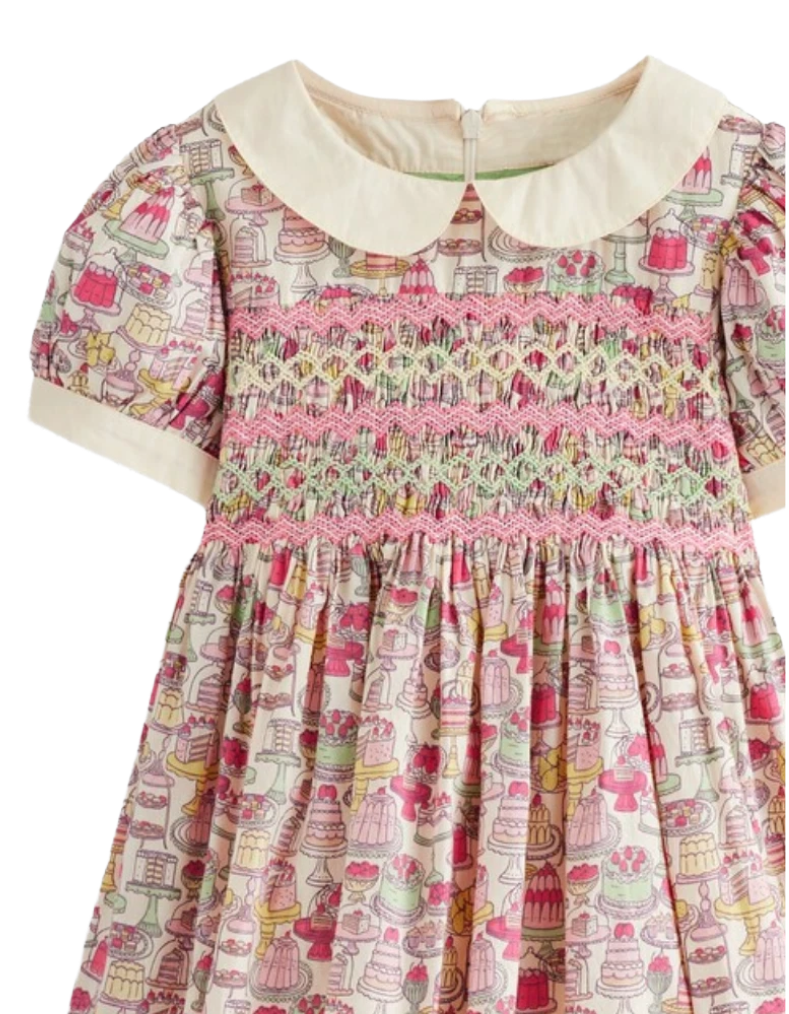 Inspired by classic childhood styles, this Mini Boden girl’s dress features delicate hand-smocking on the front and a timeless Peter Pan collar. The puffed sleeves and full skirt offer a charming silhouette, enhanced by a playful print and a voluminous bow at the back. Perfect for special occasions, this dress combines nostalgic details with expert tailoring to create a timeless look for young wearers.