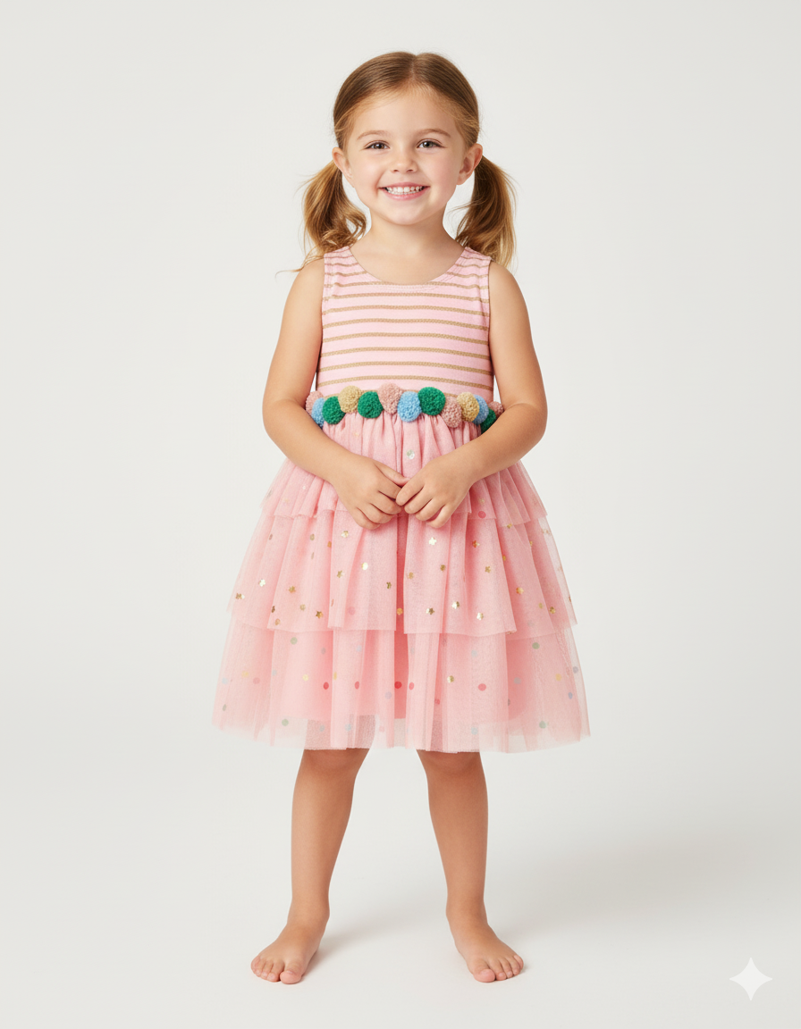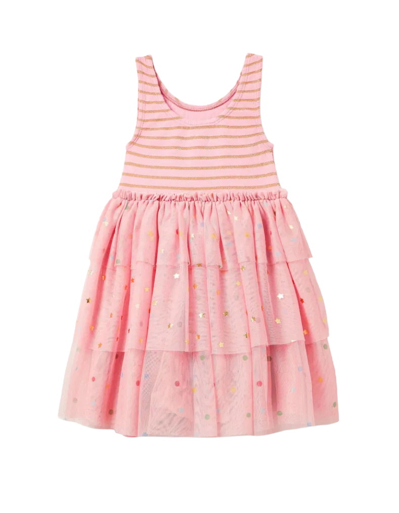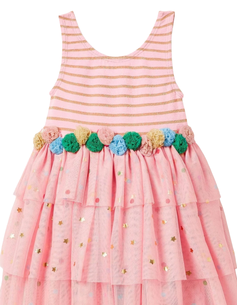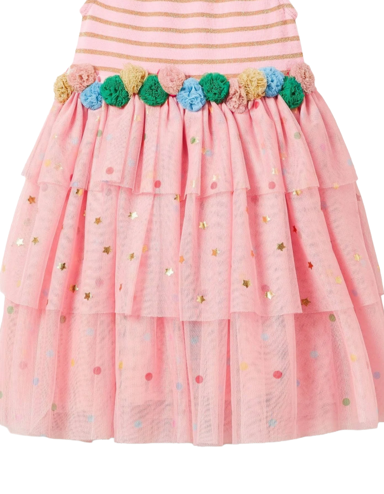 If dresses were sweets, this show-stealing sleeveless style would be pick and mix. The velvet and gold sparkly striped top pairs beautifully with a colourful pompom waistband, whilst the fully lined ruffly tulle skirt features alternating tiers of sparkling stars and rainbow-bright spots. A playful piece that captures childhood wonder with every twirl—all that's missing is fizzy laces.