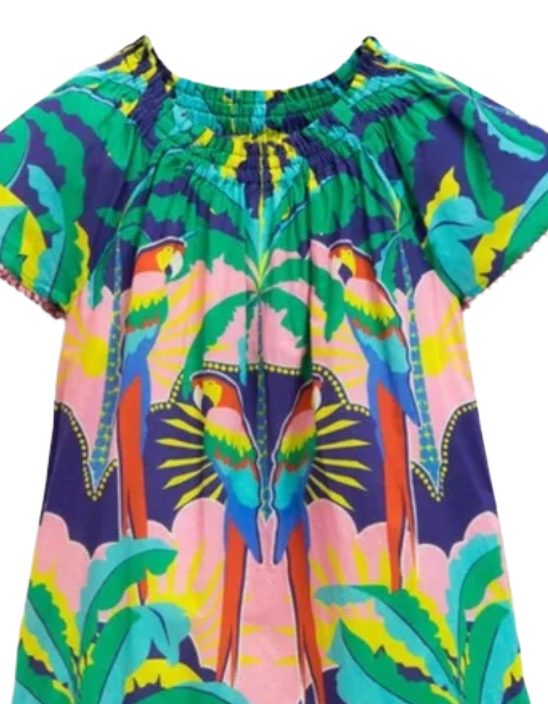 The Mini Boden Girls' Tropical Printed Smocked Kaftan Dress combines comfort and style with its lightweight 100% cotton fabric, ideal for everyday wear. Featuring a smocked neckline and ruffled sleeves, this above-knee dress offers both a flattering fit and playful charm. Its vibrant multicolour design adds a cheerful touch, while machine washability ensures easy care and durability. Perfect for warm days, this dress balances breathability and fashion effortlessly.