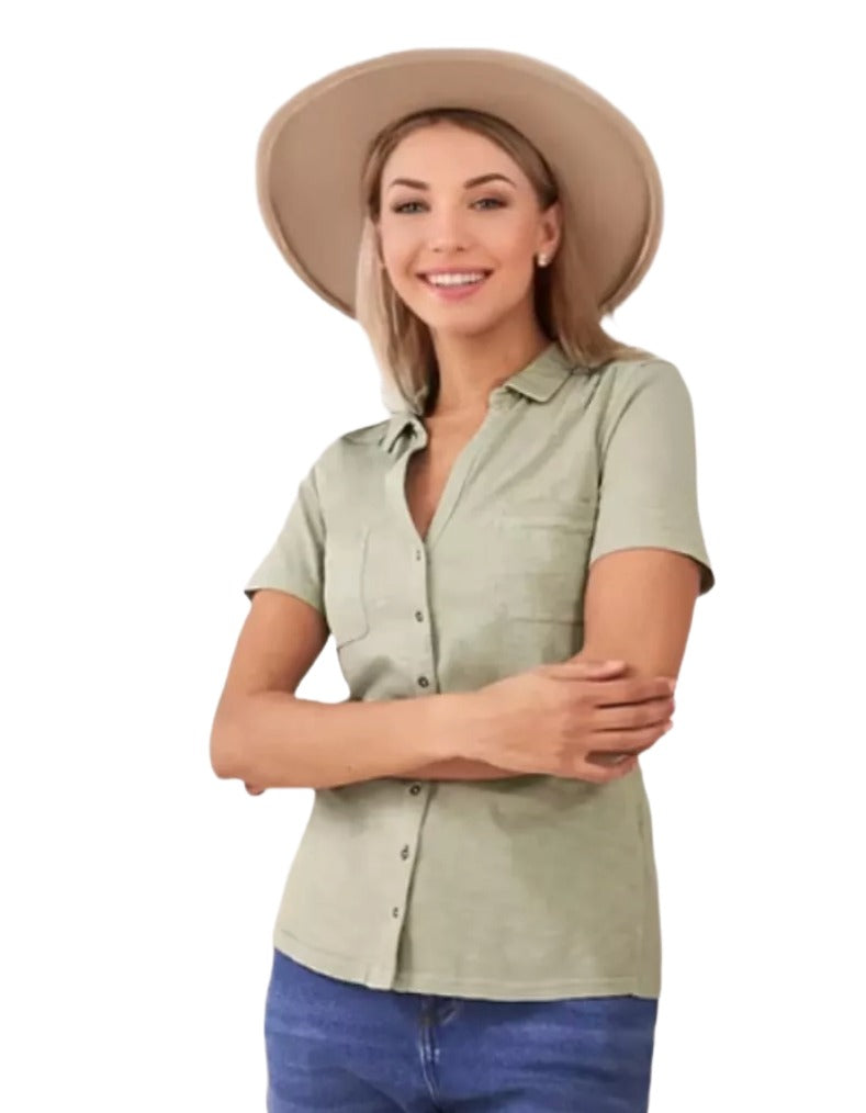 Crafted from premium 100% cotton jersey, this Women's Short Sleeve Pocket Jersey Shirt delivers effortless sophistication for modern wardrobes. The breathable fabric ensures all-day comfort, whether you're navigating video calls or casual outings. Its versatile dusty green hue pairs seamlessly with everyday essentials, while the practical pocket detail adds functional style. The relaxed yet polished silhouette flatters various body types, making it an essential layering piece that transitions seamlessly from work to weekend wear.