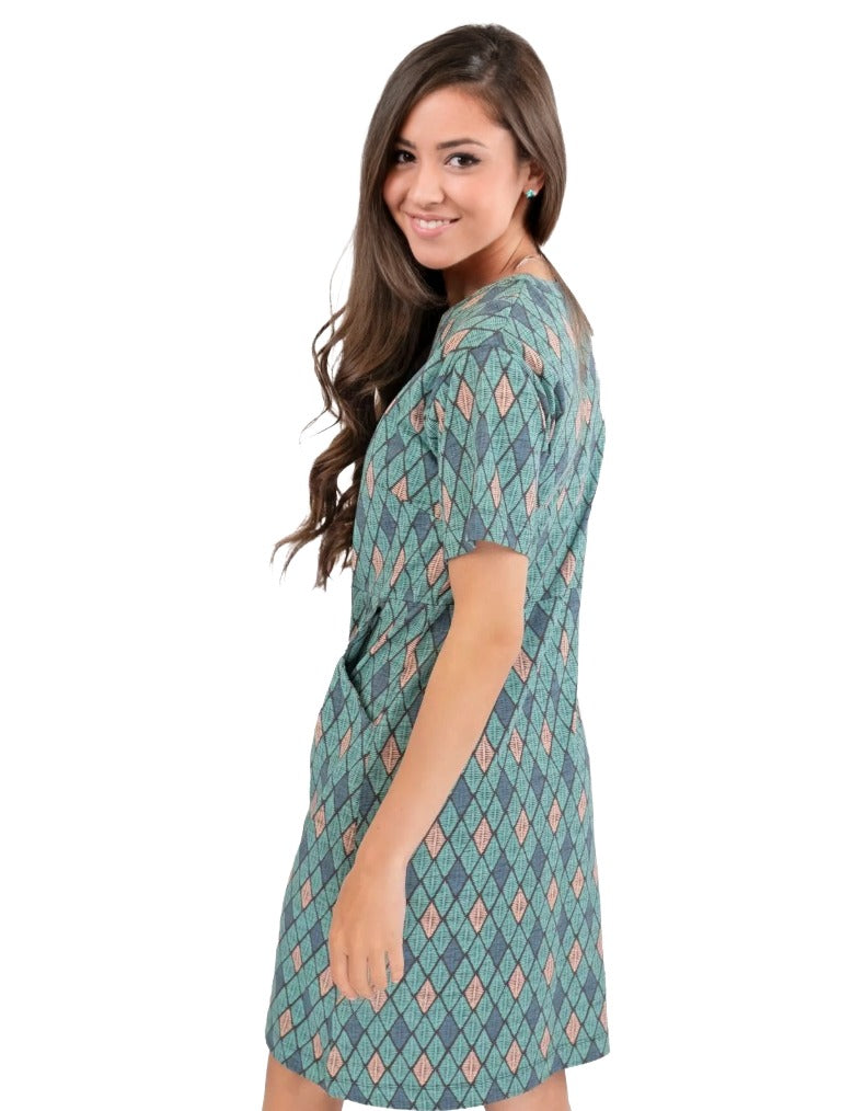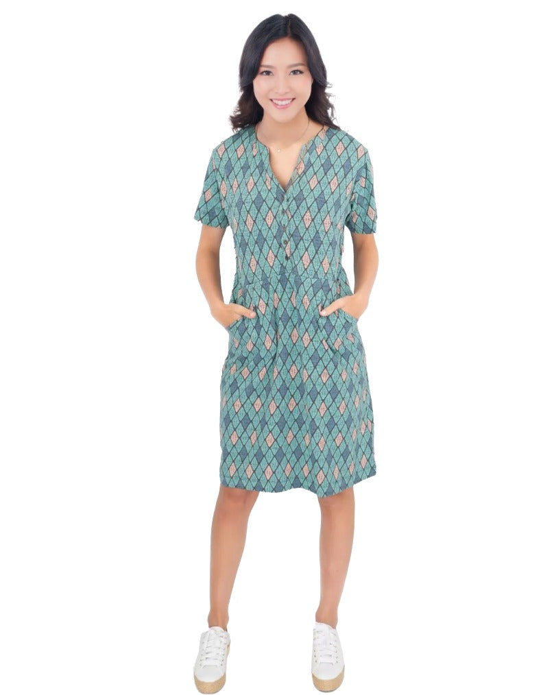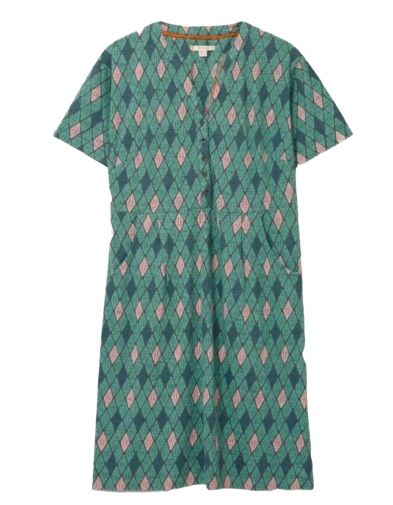 Women's Tammy Cotton Jersey Knee Length Dress in Green Crafted from pure cotton jersey, this knee-length dress delivers effortless comfort and versatility. The geometric print adds visual interest to a streamlined silhouette, while the short sleeves provide practical everyday wear. The soft, breathable fabric moves with you, making it ideal for casual outings or relaxed office settings. A timeless piece that transitions seamlessly from season to season.