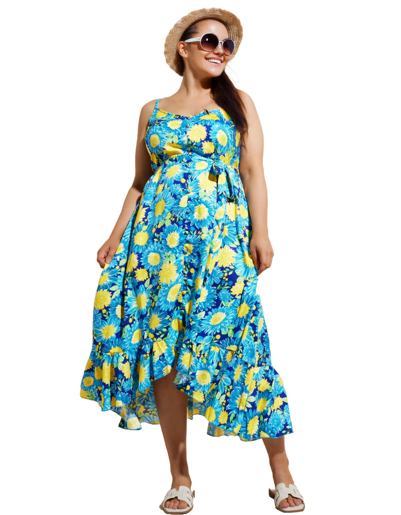 Add a touch of spring to your style with our floral print dress. Crafted from a soft woven fabric, it boasts a frilled hem and adjustable straps for a comfortable fit. Complete with a tie belt, this versatile piece can be dressed up or down with heels or trainers.