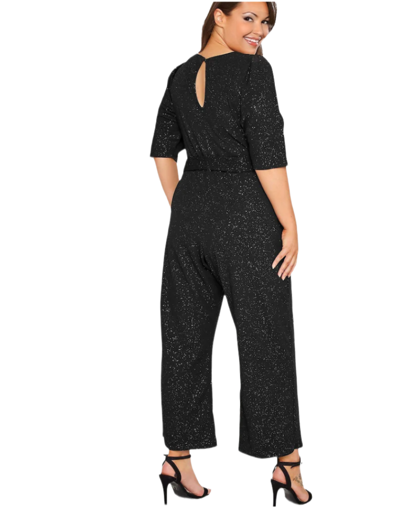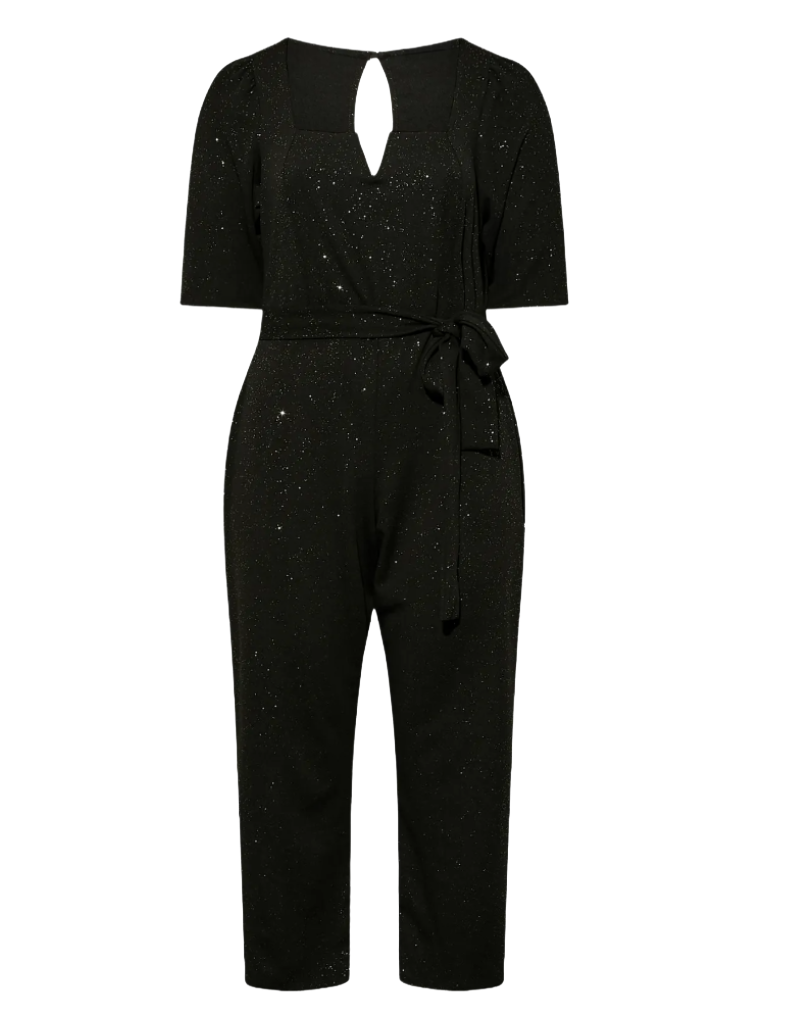 Elevate your weekend wardrobe with this Women's Glitter Notch Neck Tie Waist Jumpsuit in Black. Designed with a flattering square notch neckline and a tie waist belt, it accentuates your figure effortlessly. The short sleeves and straight leg design offer a balanced silhouette, while the subtle glitter adds a touch of sophistication. Pair with heels and a blazer for an elegant and polished look that transitions seamlessly from day to night.