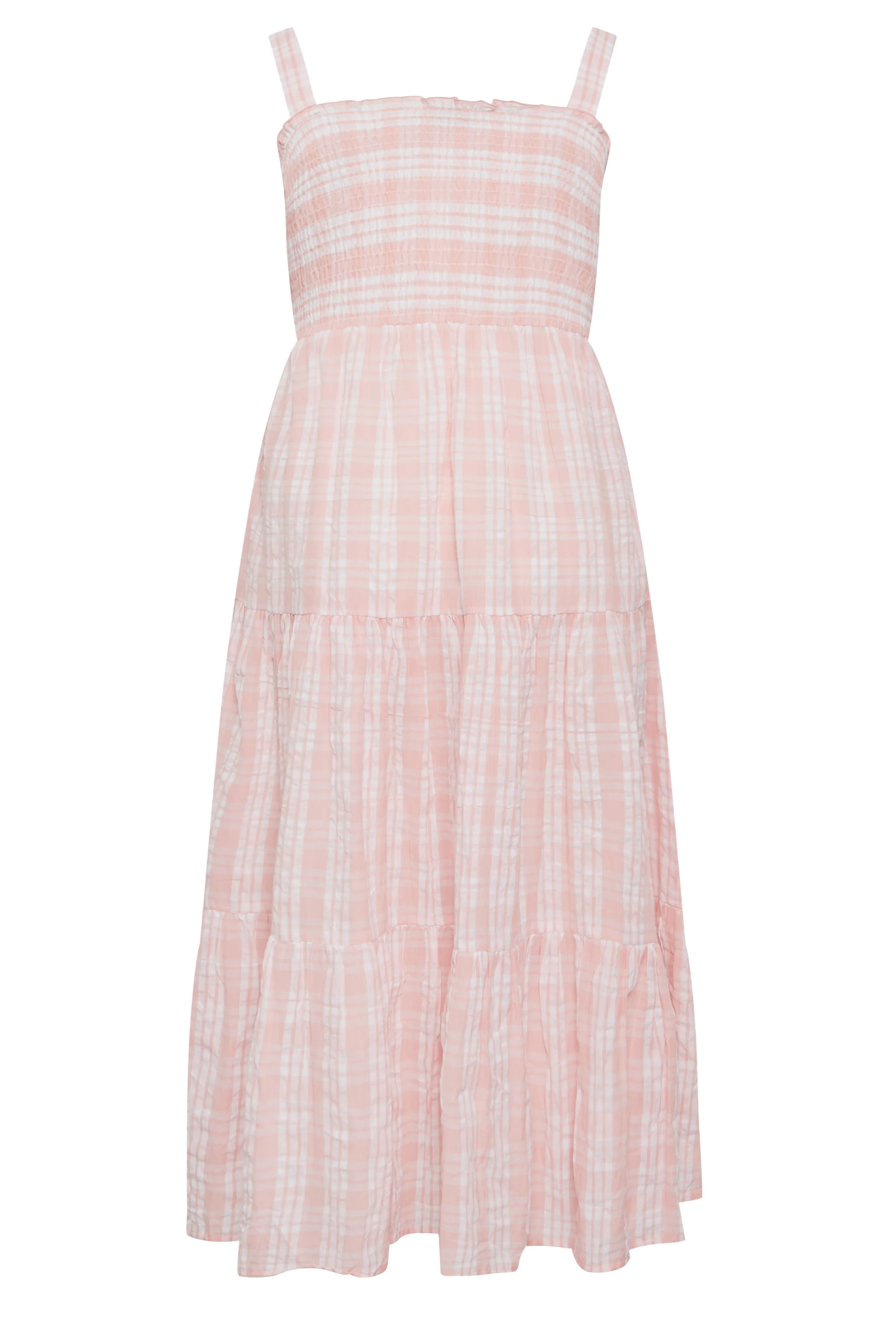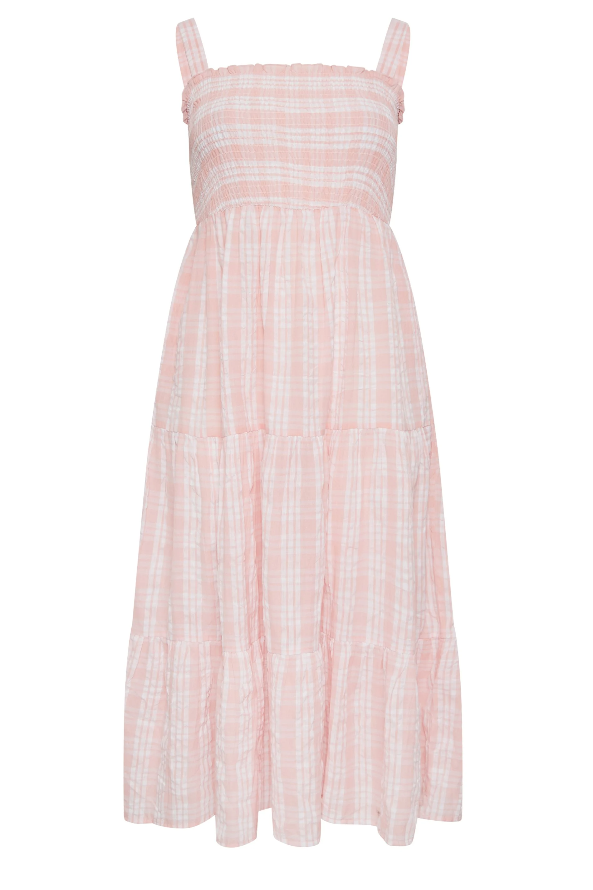 Embrace effortless summer style with this plus size shirred sundress in a vibrant pink check print. Crafted from comfortable woven fabric, it features a flattering square neckline and a sleeveless design that keeps you cool. The maxi length offers elegant coverage, while practical side pockets add convenience. Perfectly balanced between casual and chic, this dress pairs beautifully with trainers or sandals for versatile, all-day wear. Ideal for warm weather, its shirred detailing ensures a comfortable fit that complements your silhouette with expert tailoring.