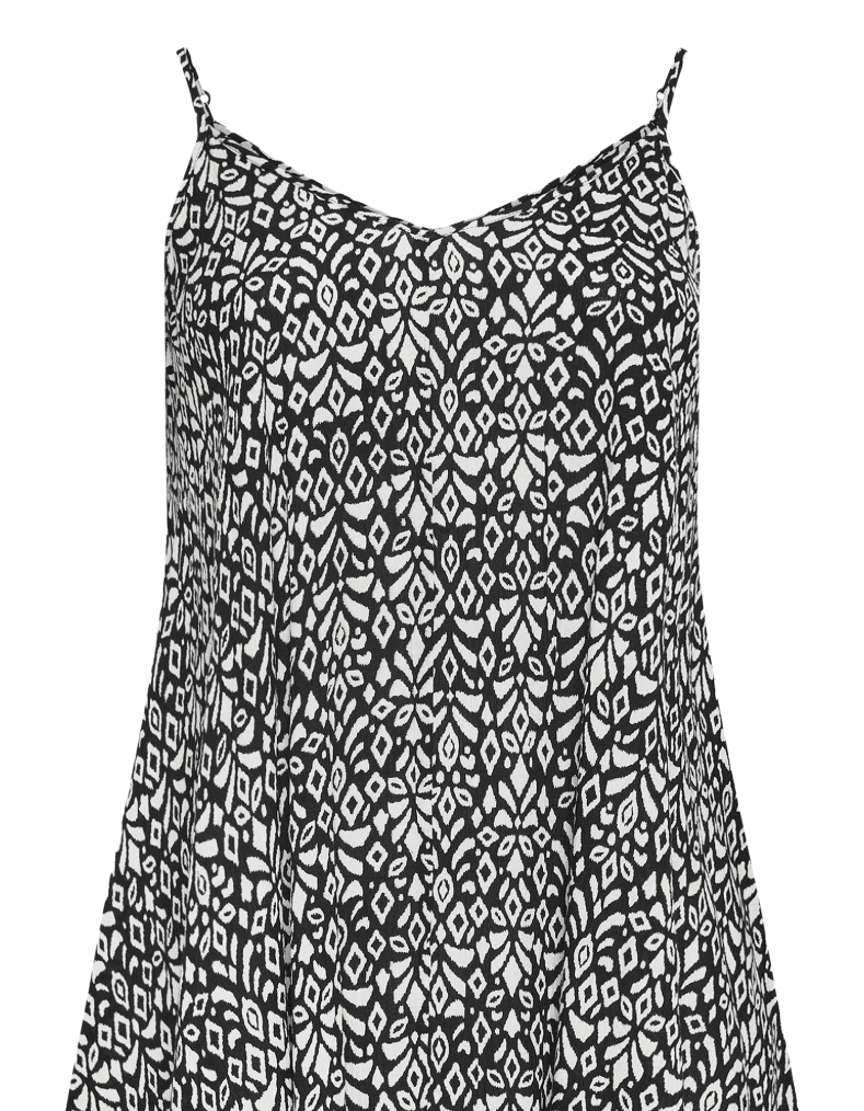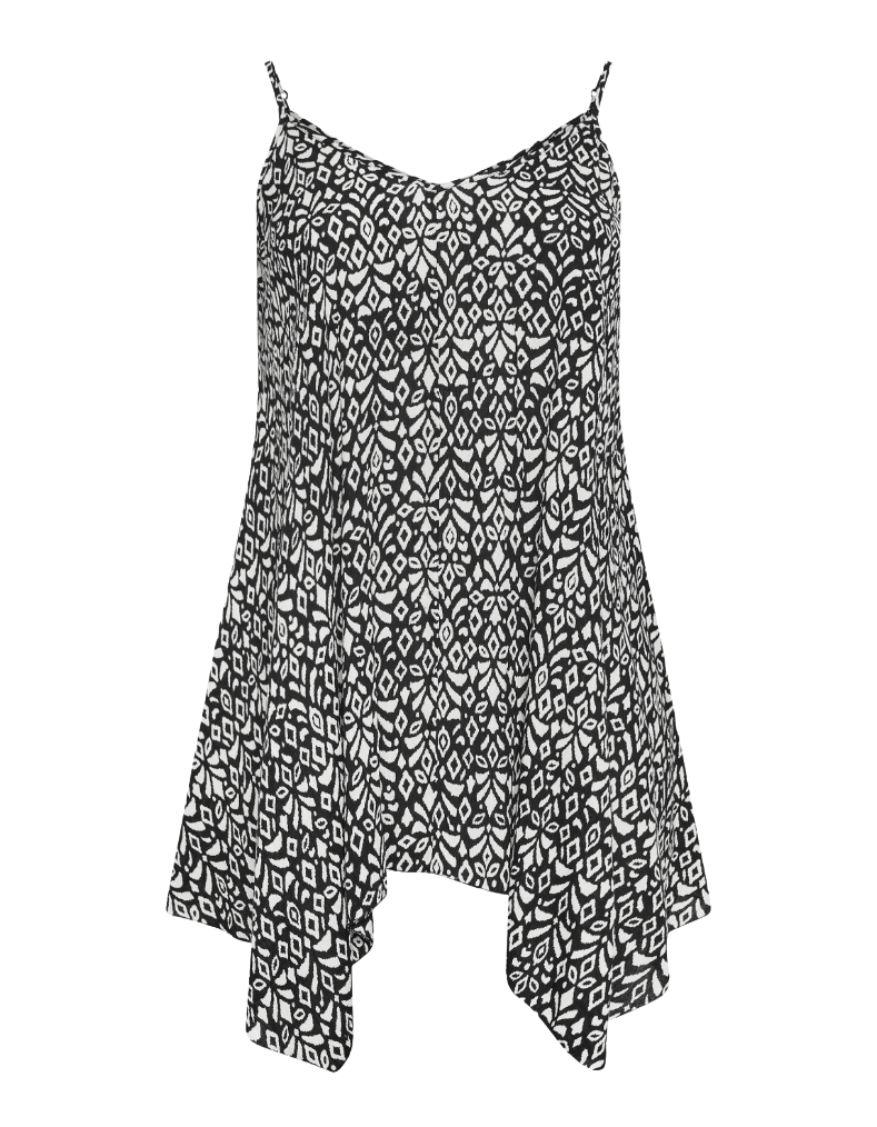 Introducing our Women's Plus Size Ikat Print Cami in Black. Elevate your summer wardrobe with this soft woven fabric cami. Featuring an ikat print, hanky hem and v-neckline for a stunning and versatile look. Perfectly paired with shorts or a skirt for any occasion.