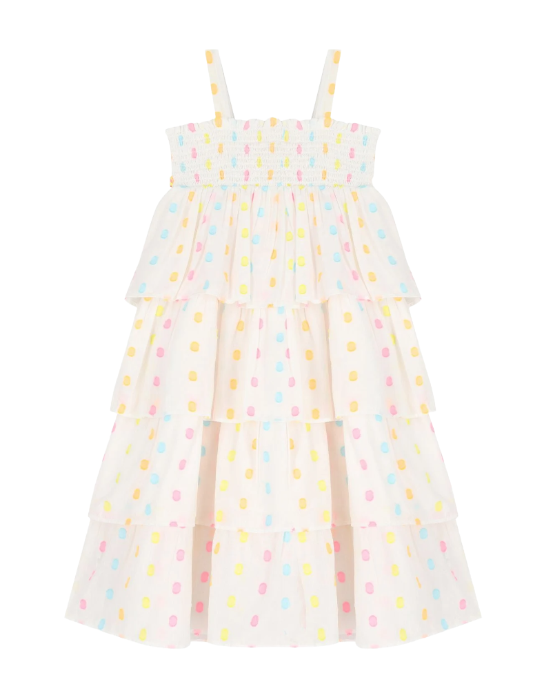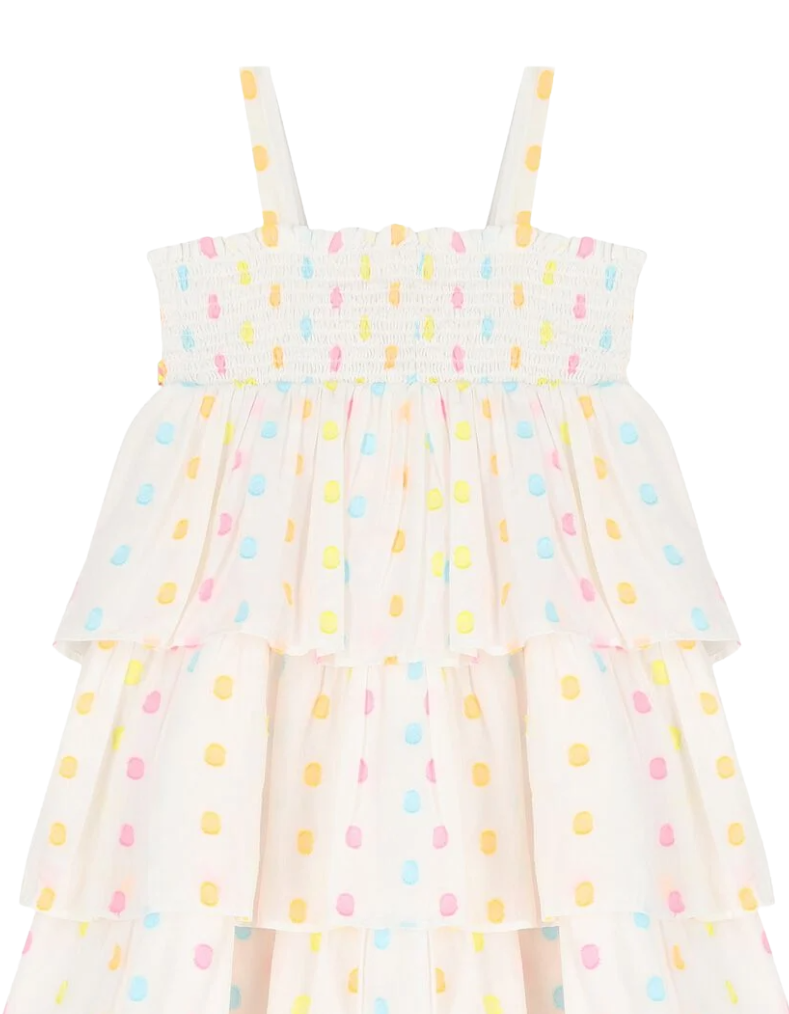 Discover effortless elegance with this charming BILLIEBLUSH dress for girls. Crafted from soft cotton, it features a vibrant multi-coloured polka dot print that brings playful personality to any occasion. The shirred bodice provides a comfortable, stretchy fit perfect for active play, while the layered skirt adds beautiful volume and movement. Delicate shoulder straps complete the design, making it an ideal choice for summer outings, parties, or everyday wear. A timeless piece that combines style with comfort.