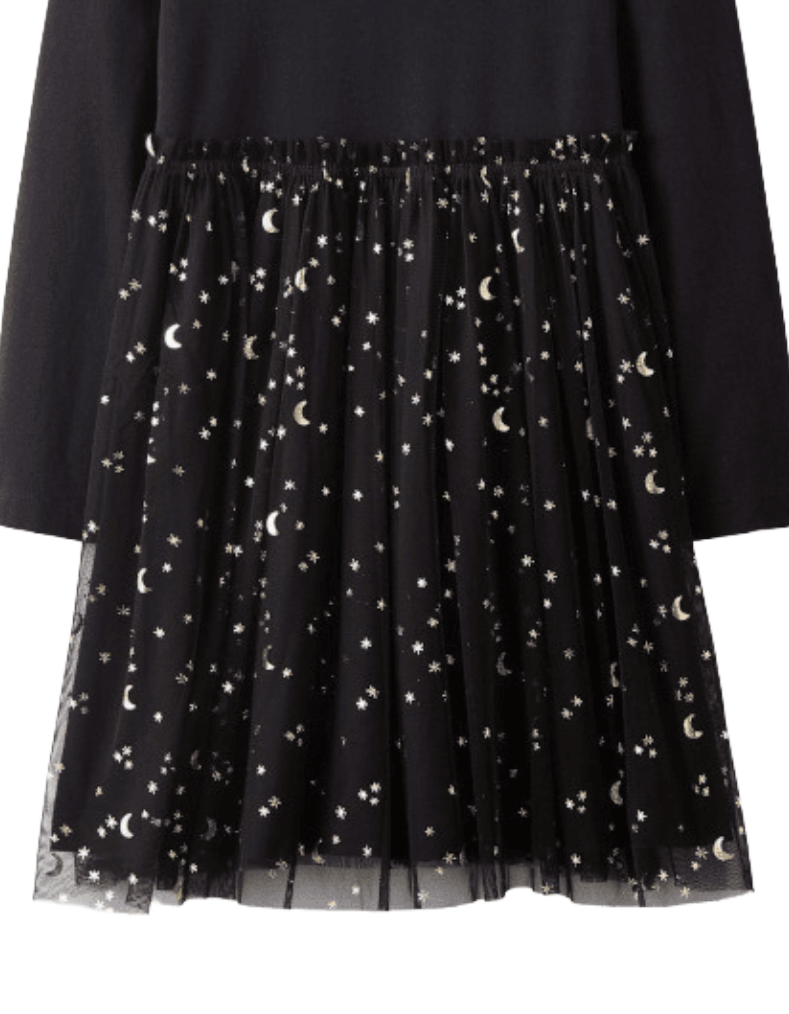 This dress features a fitted bodice made from a soft, stretchy blend of 95% cotton and 5% spandex jersey, ensuring comfortable movement. The gathered skirt is crafted from lightweight poly tulle, adding playful volume. Designed with an above-the-knee length, it offers a flattering silhouette perfect for festive occasions. Its black star print lends a stylish Halloween charm, combining comfort and seasonal style seamlessly.