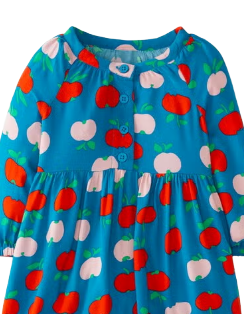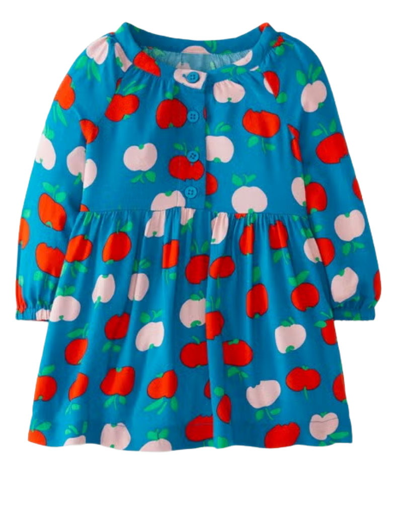Crafted from 100% sustainable viscose woven challis, the Hanna Andersson Girls' Woven Printed Dress in Blue Apples offers breathable comfort and eco-friendly style. Its raglan sleeves with encased elastic wrists ensure a flexible fit, while the front button placket provides easy wear. A gathered skirt adds gentle volume and movement, making this dress both practical and charming for everyday wear.