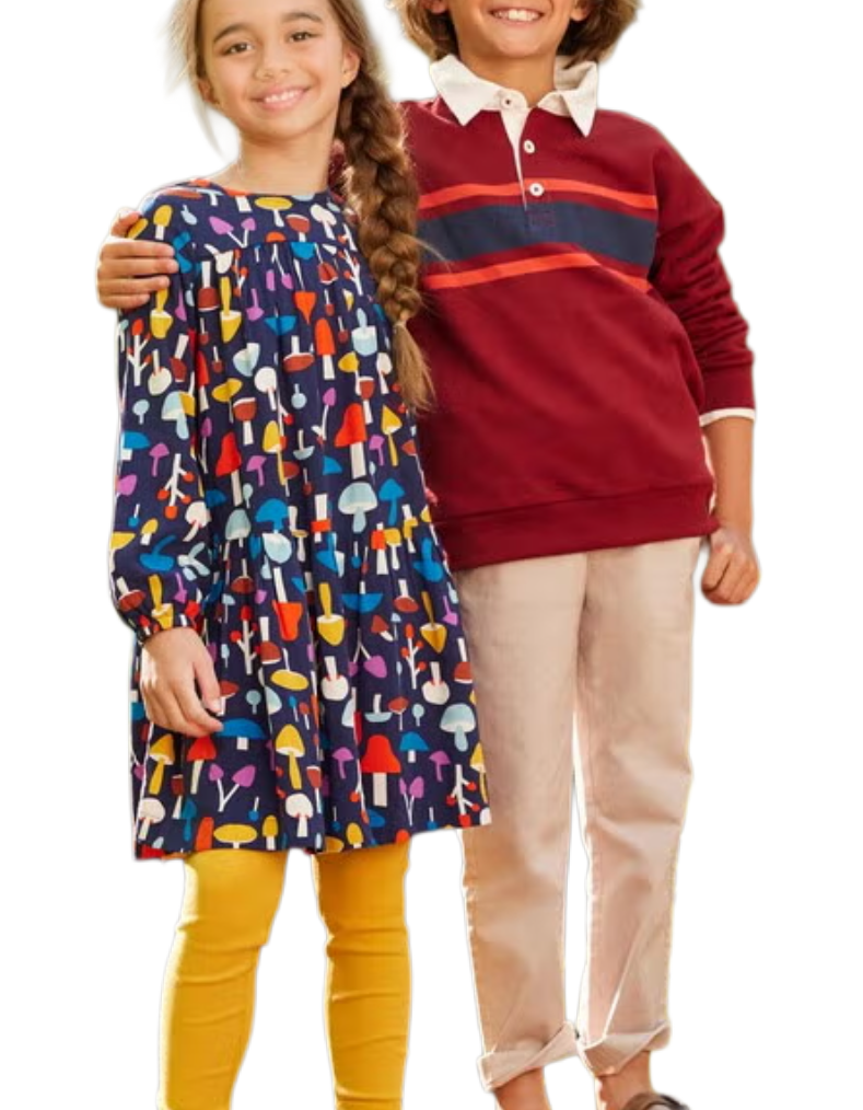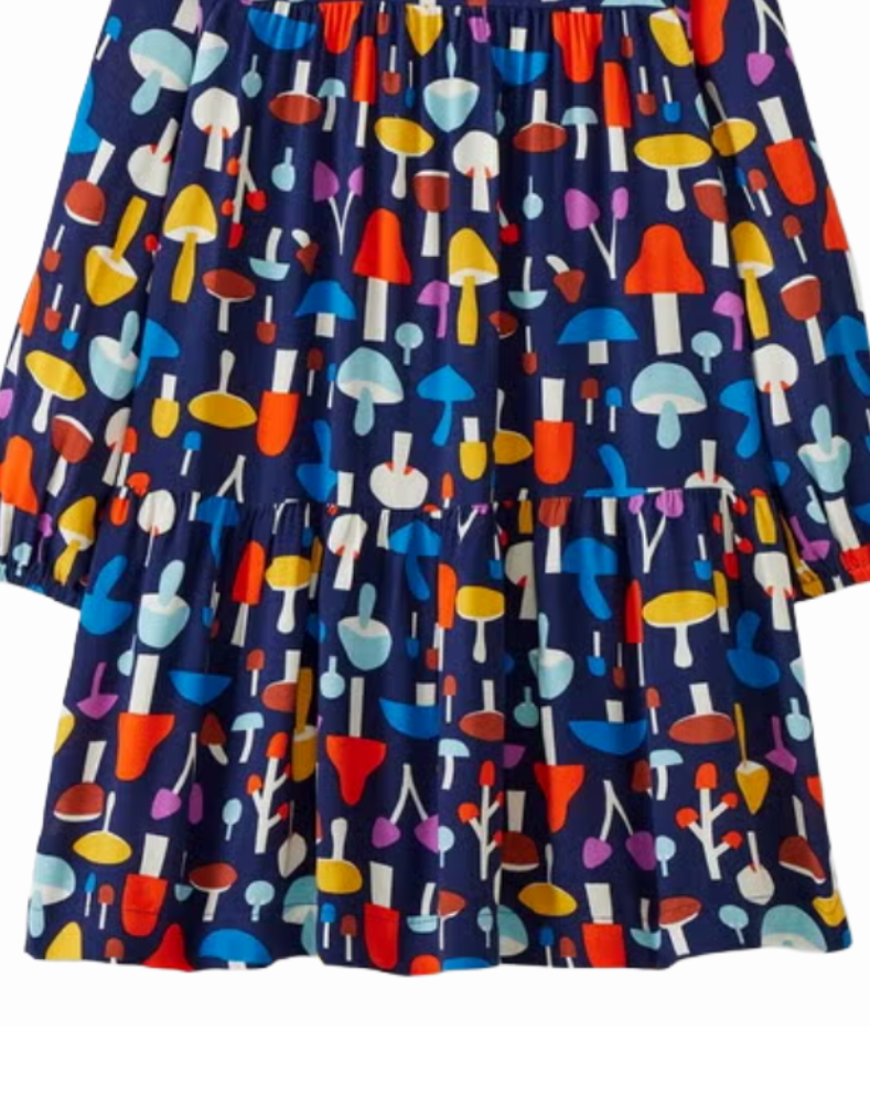 The Hanna Andersson Girls' Woven Twirly Dress in Blue with Moody Mushrooms features a charming mushroom print on a soft blue background, crafted from breathable woven fabric for comfort and ease of movement. Designed for twirling fun, its full skirt and flattering fit provide both style and playfulness, making it an excellent choice for everyday wear or special occasions. Durable and thoughtfully made, this dress combines practical design with a whimsical pattern that kids will love.