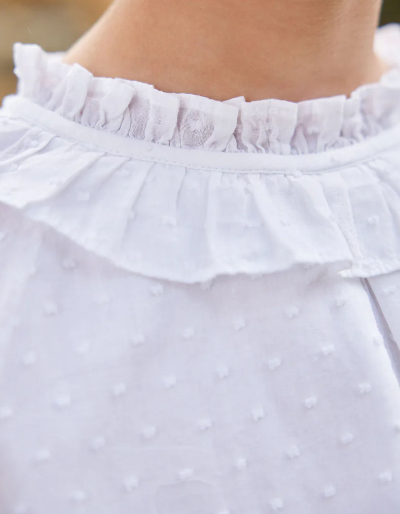 The Little English Girls' Dobby Lauren Blouse in Ivory is crafted from delicate swiss-dot fabric, featuring a charming ruffled collar and sleeves that add subtle elegance. Its three-button back closure ensures a secure fit, while the refined detailing enhances versatility—perfect for pairing with casual bootcut pants or festive skirts. This timeless blouse effortlessly combines style with comfort, making it a sophisticated staple for any young girl’s wardrobe.