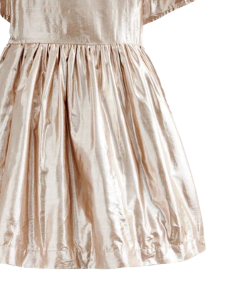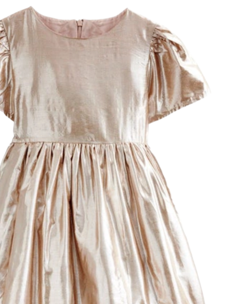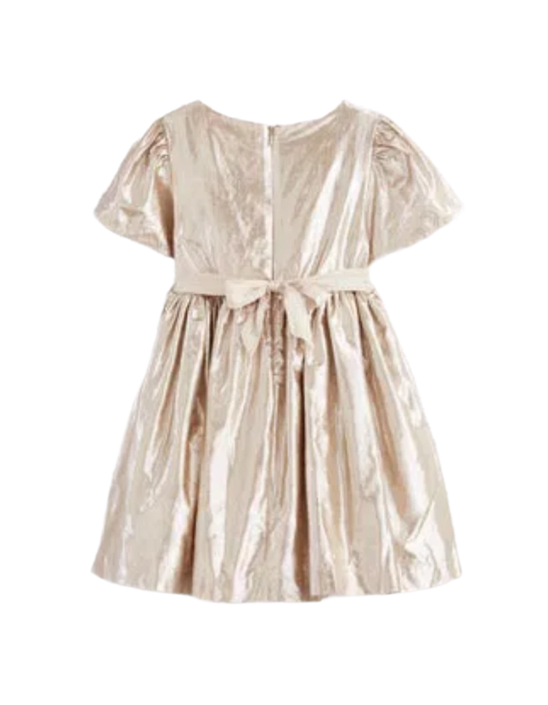 We've wrapped up this extra-special party dress with a big bow on the back. It also has puff sleeves, gentle waist gathers and a full skirt. We'd mention the shiny fabric but you probably already spotted that.