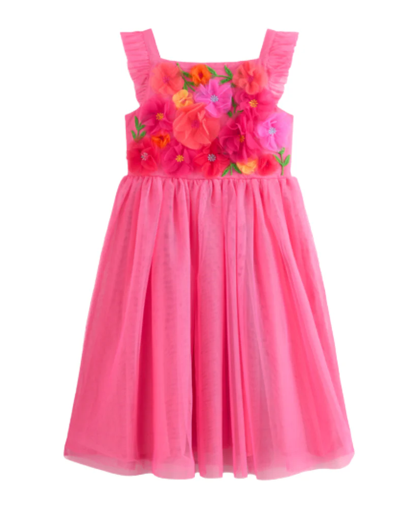 This Mini Boden Girls' Floral Applique Tulle Dress in Green features a full gathered skirt adorned with delicate appliqué flowers that move gracefully. Designed with a flattering square neckline and flutter straps, it ensures a charming silhouette, while the shirred back panel offers a comfortable fit. Practical and stylish, this dress is machine washable for easy care.