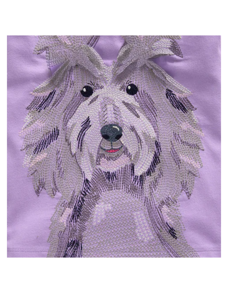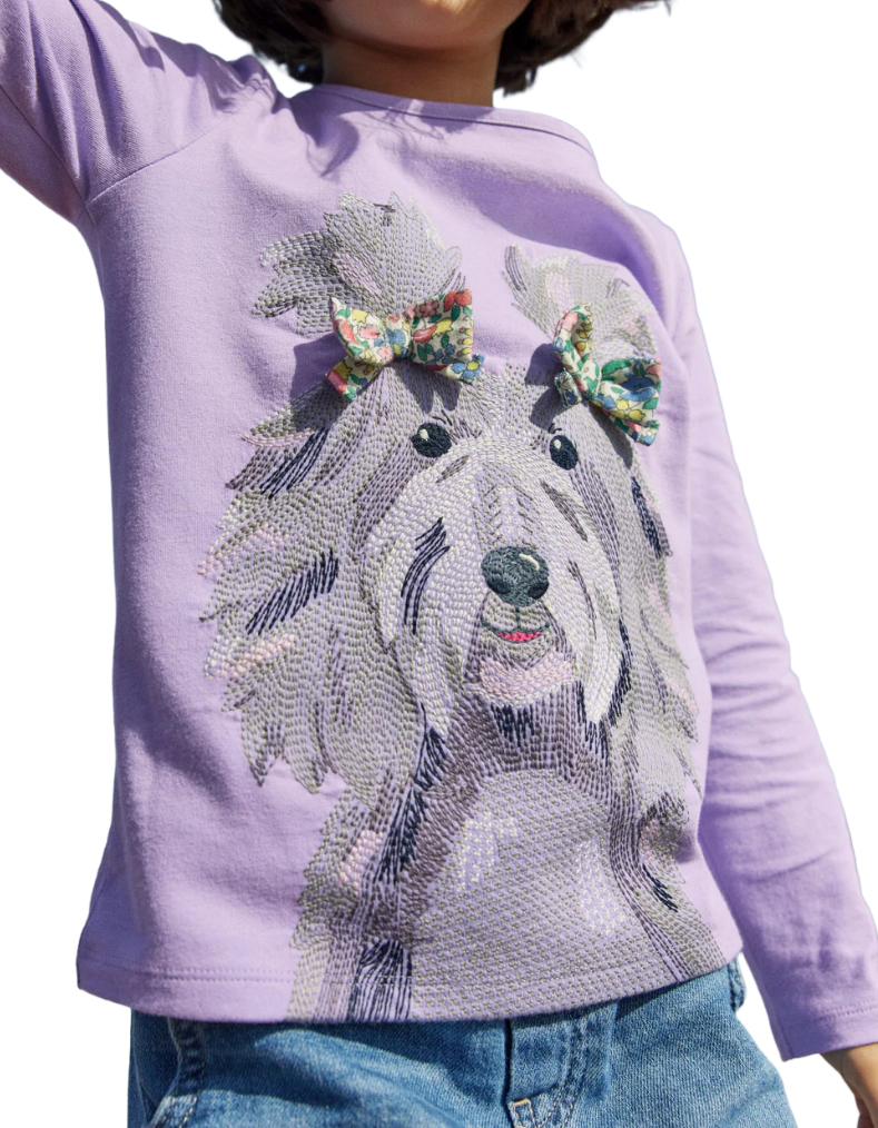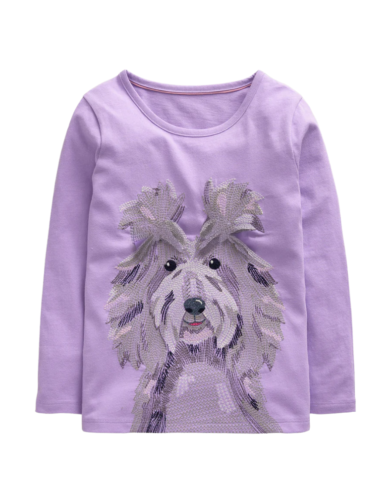 This Mini Boden girls' long sleeve T-shirt combines comfort and style with its 100% cotton fabric and standard fit. Featuring a charming purple dog design and an embroidered logo, it offers durability and a playful touch. Machine washable for easy care, this clearance item is a practical and stylish choice for everyday wear.