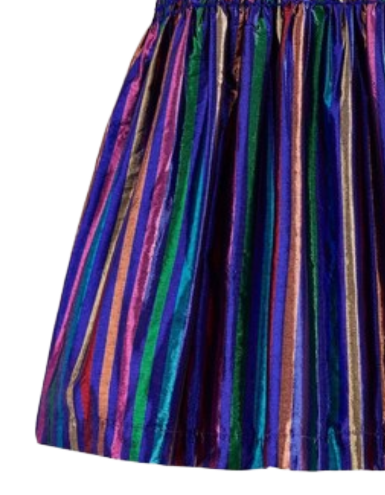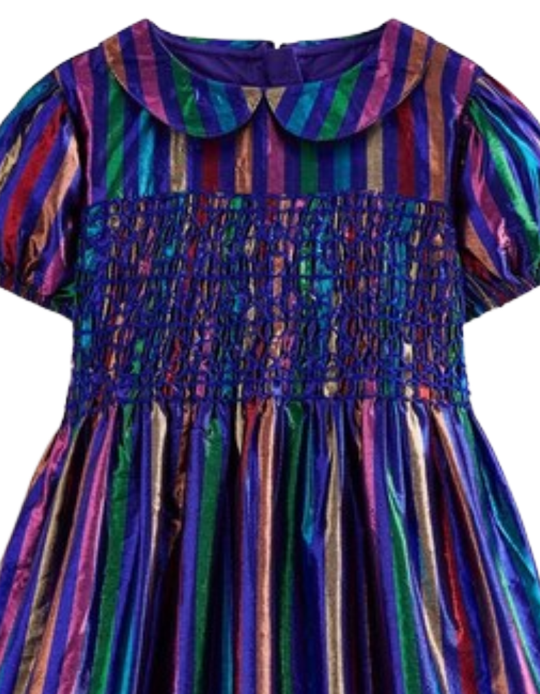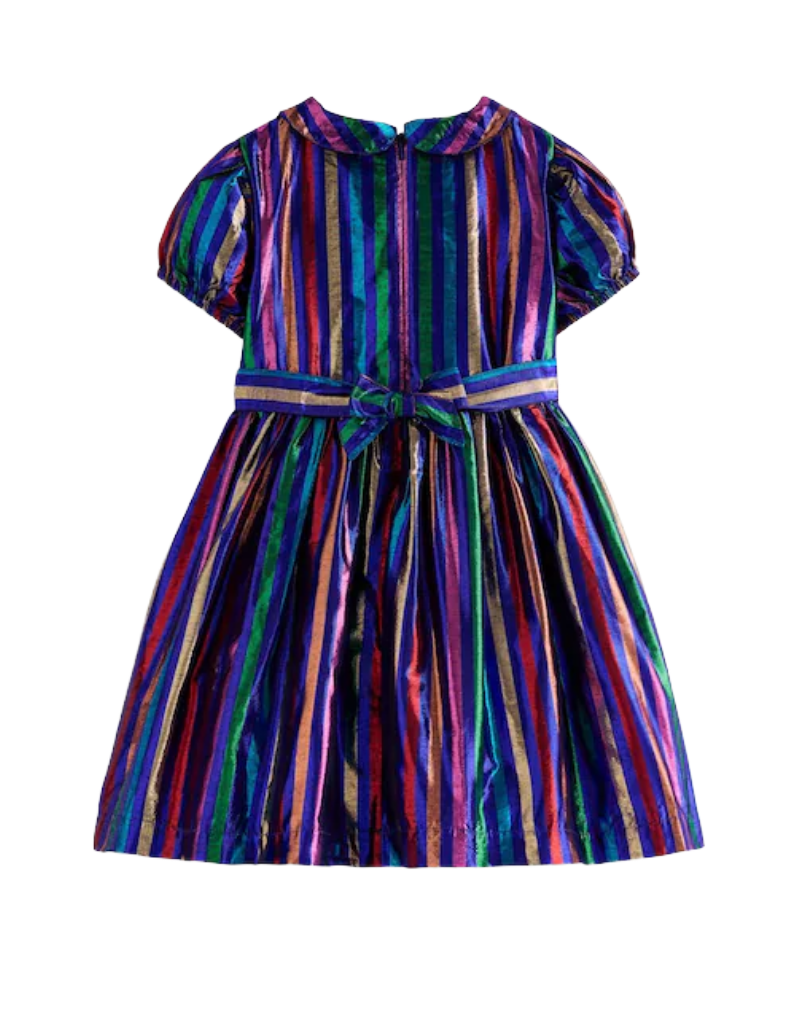 This Mini Boden girl's party dress features elegant puff sleeves, subtle waist gathers, and a full skirt that creates a charming silhouette. Crafted from a distinctive metallic stripe fabric, it adds a festive shimmer perfect for special occasions. Designed with attention to detail, this dress combines comfort and style for memorable celebrations.