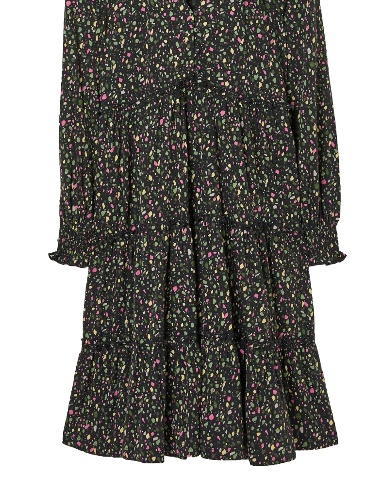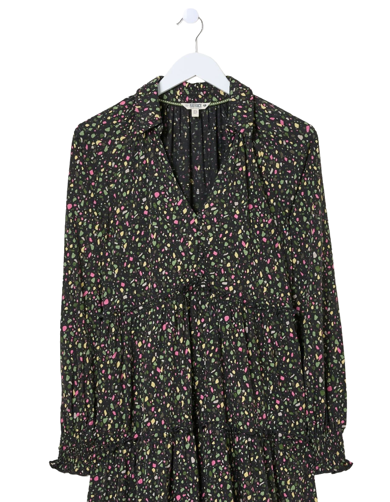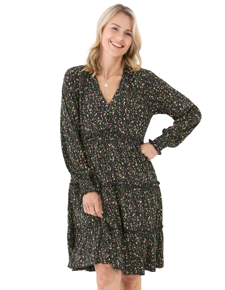 Women's Long Sleeve Ivana Ditsy Marks Dress in Black Make a statement with the Ivana dress, featuring an eye-catching all-over print that transitions seamlessly from office to weekend wear. Crafted from a breathable cotton and modal blend, this long-sleeve design delivers exceptional comfort without compromising on style. The thoughtfully engineered stretchy cuffs, refined neckline, and tiered silhouette create a flattering fit that adapts to your personal aesthetic—pair with boots for polished professionalism, sandals for casual elegance, or heels for evening sophistication.