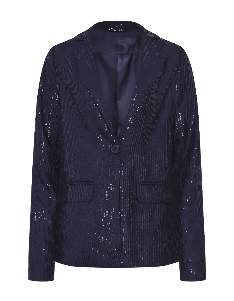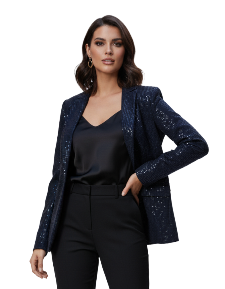 Elevate your evening attire with the Women's Tall Size Embellished Tailored Blazer in Midnight Navy. Crafted from a comfortable woven fabric, this blazer features elegant sequin embellishments and an open lapel collar that enhances its sophisticated silhouette. Functional front pocket pouches and a button fastening complete the design, combining style with practicality. Perfectly paired with matching trousers, it offers a refined, coordinated look for any formal occasion.