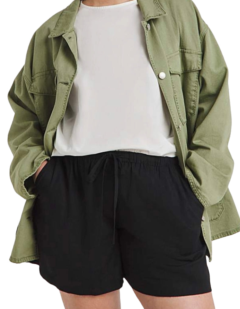These expertly designed Women's Tie Waist Linen Mix Shorts in Black combine functionality with refined style. The adjustable tie waist ensures a personalized fit while the floaty silhouette offers elegant movement and all-day comfort. Crafted in a versatile black wash, these wardrobe staples transition effortlessly from casual to polished when paired with sandals and a basic tee for sophisticated daytime styling.