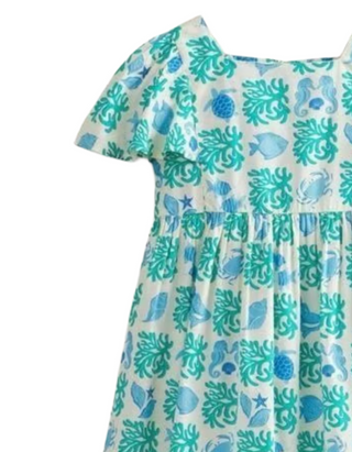 Mini Boden Girls' Printed Aqua Lagoon Flutter Dress in White Corals