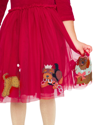 Mini Boden Girls' Velvet Tulle Applique Dress in Carmine Red Festive Dogs
