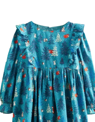 Mini Boden Girls' Frill Tiered Woven Dress in Green Forest Toile