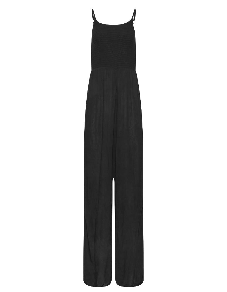 This sleeveless jumpsuit in crinkle woven fabric features adjustable straps, shirred upper detail, and a scoop neckline. Designed with a wide-leg fit, it offers effortless style perfect for summer, especially when paired with sandals.