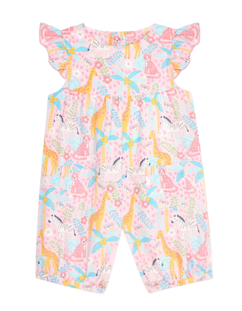 Discover the perfect summer essential with this charming safari-themed sunsuit. Featuring adorable animal prints against soft blushed pink, complete with delicate frilly sleeves, it's designed to capture little ones' imagination whilst keeping them stylish. Crafted from breathable cotton, this sunsuit ensures all-day comfort and temperature regulation during warm weather play. The practical all-in-one design eliminates dressing struggles, whilst convenient button fastenings at the back and leg poppers make nappy changes effortless. An ideal choice for parents seeking both functionality and playful style.