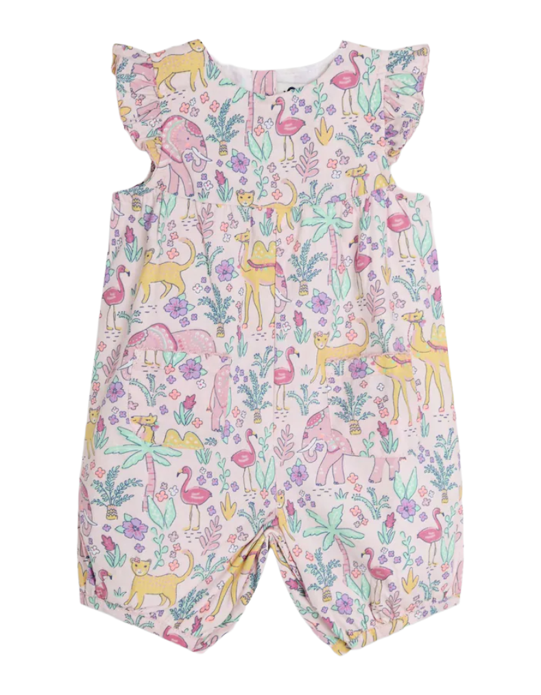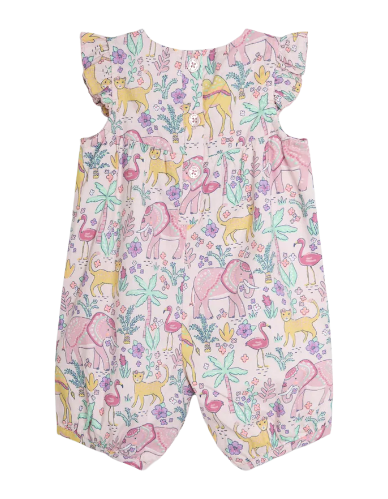 This JoJo Maman Bébé Tropical Animals Pretty Ruffle Jumpsuit in Coral Pink combines playful design with practical features. Crafted with soft fabric, it showcases a charming elephant and floral pattern, ruffle shoulder details, and elasticated leg openings for comfort and ease of movement. Two handy pockets add functionality for little explorers, while the back buttons ensure quick and simple dressing. Ideal for warm days, this sunsuit provides a stylish yet comfortable option for your child’s outdoor adventures. Please note, this item is sold as imperfect but retains full wearability.