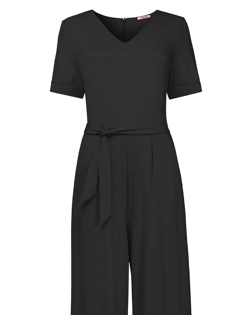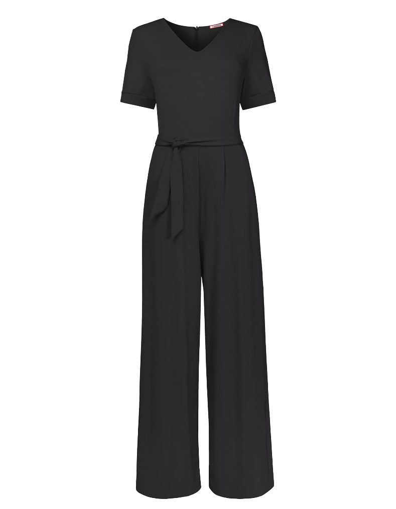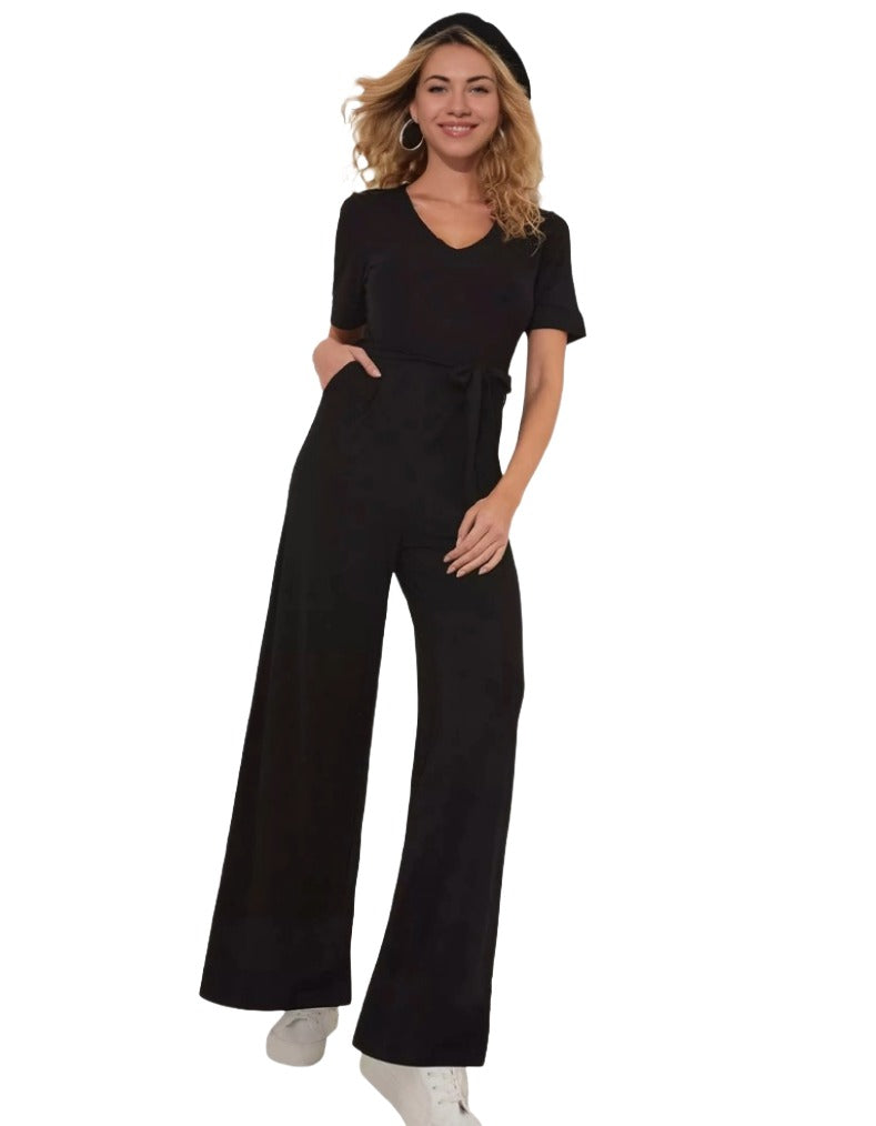 The Women's Isla Stretch Jersey Jumpsuit in Black features short sleeves and a V-neck for a modern summer update. Crafted from soft jersey fabric, its belted waist and wide legs flatter every figure, offering all-day comfort and style. Perfectly versatile, it transitions effortlessly from day to night with your favorite accessories.