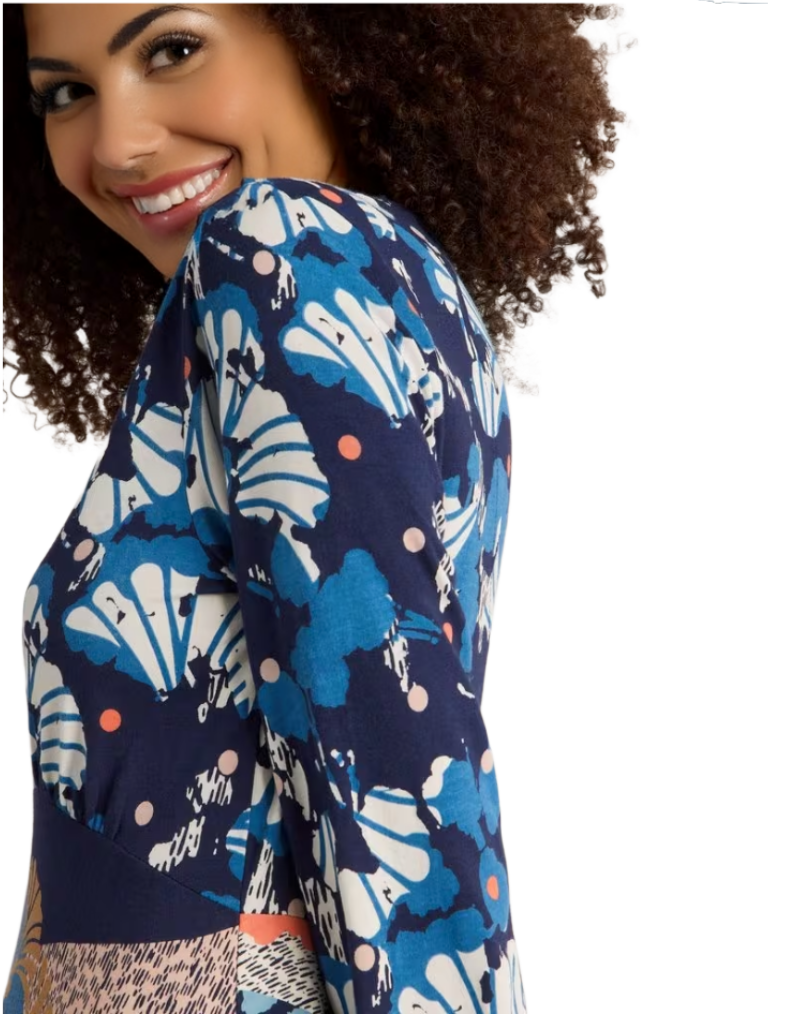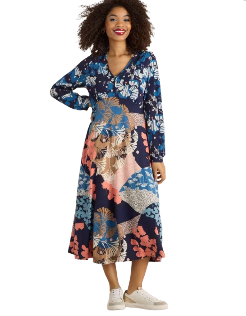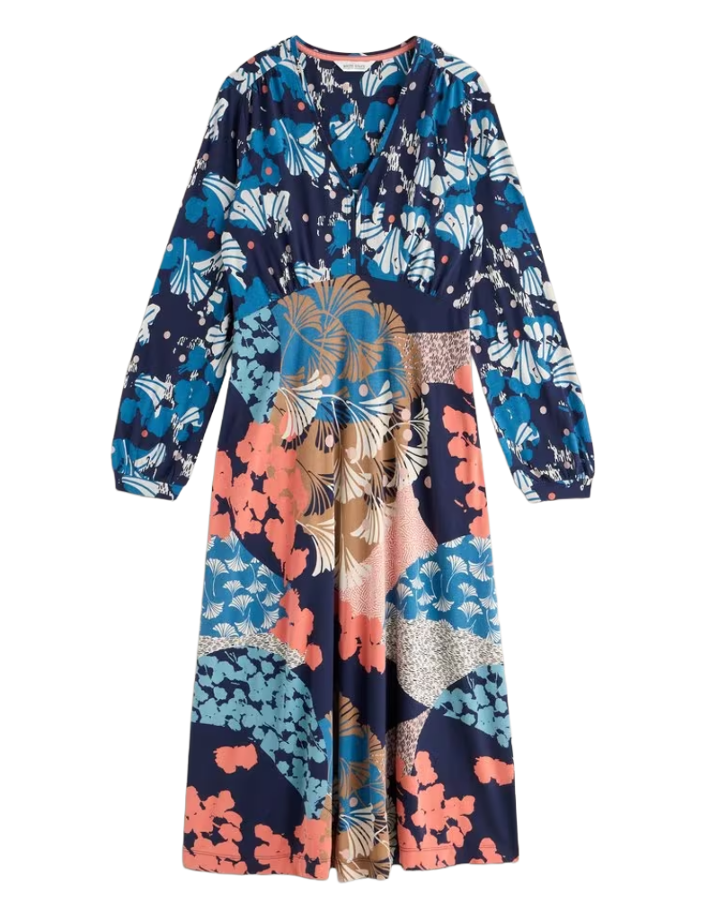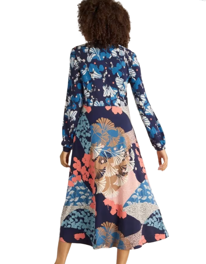 Effortlessly transition from day to night in this versatile midi jersey dress. The long sleeves and flattering cut work beautifully for gallery strolls and casual park outings, while the refined silhouette elevates any evening occasion. Crafted in soft jersey fabric with a timeless navy multi palette, this piece adapts to your lifestyle—dress it down with trainers for weekend ease or up with heels for something special. A wardrobe essential that moves with you.
