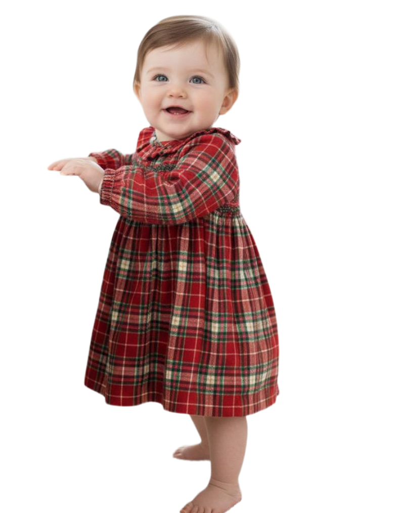 This Baby Boden Girls' Woven Check Smocked Dress in Red Mix offers comfort and breathability. Featuring mini ruffles on the collar, cuffs, and hem, it adds a playful yet refined touch. Traditional front-stitched details enhance its classic appeal, while back buttons provide convenient dressing, making it an ideal choice for festive occasions.