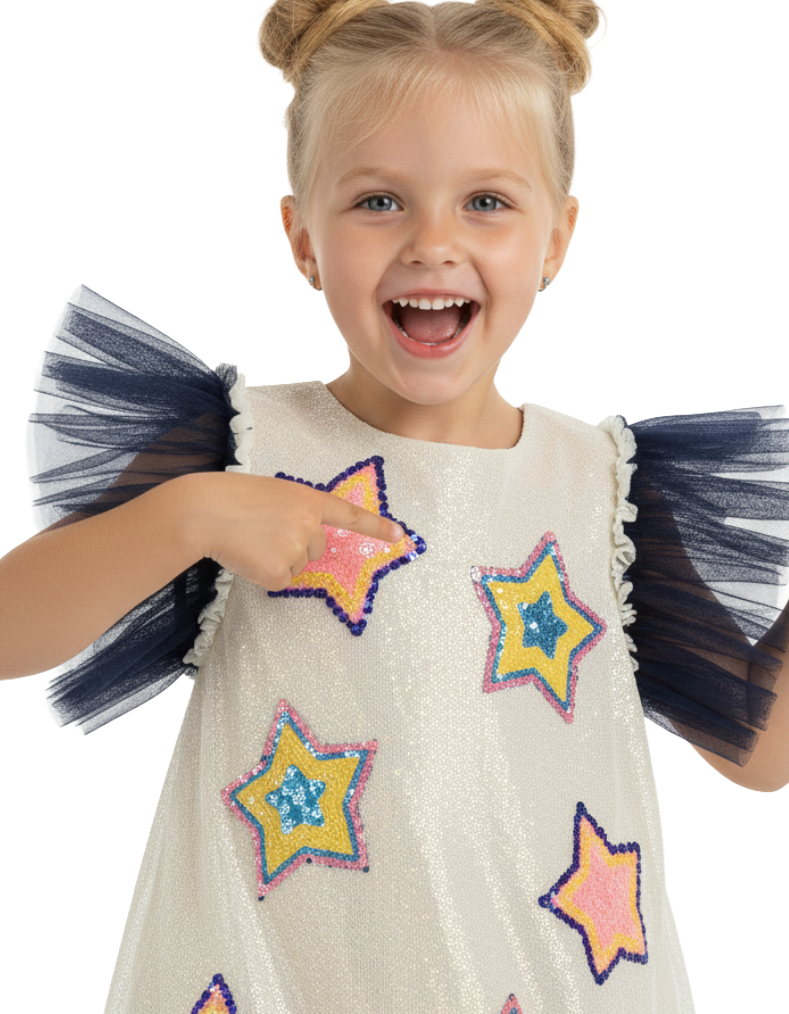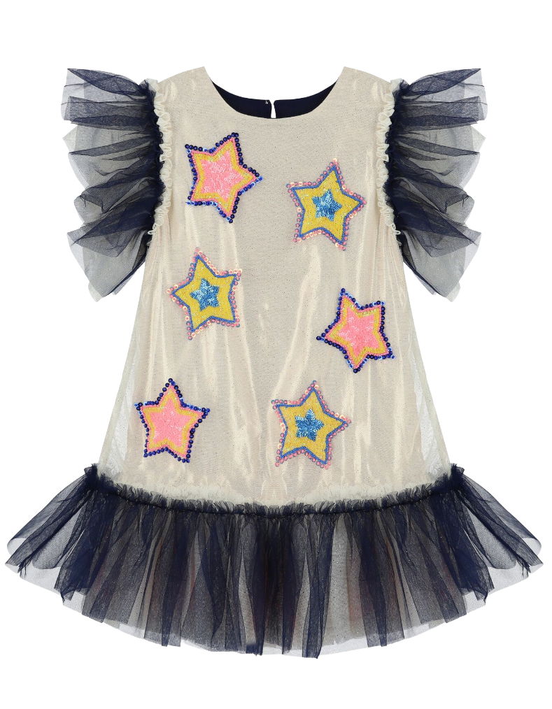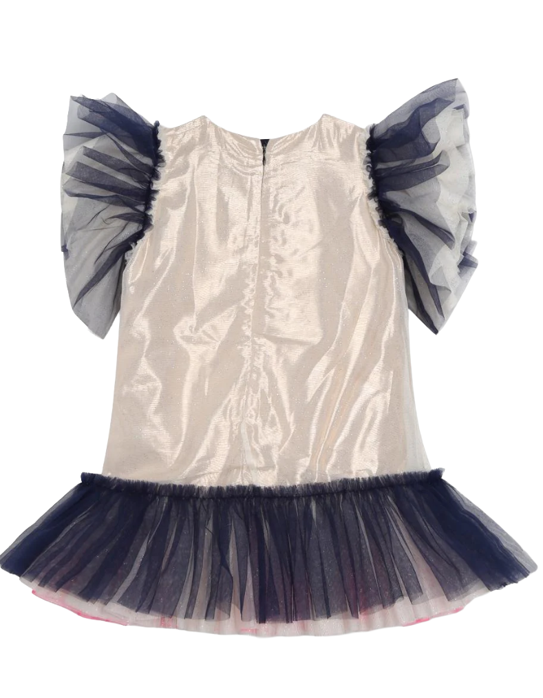 This Billieblush girls' mesh tulle dress in unique ecru features a round neckline and flounced cuffs and hem, creating a delicate silhouette. The back zip closure ensures a secure fit, while the front is adorned with an elegant illustration crafted from pearls and sequins, adding a refined decorative touch. Ideal for special occasions, this dress combines sophisticated design with exquisite detailing for a standout look.