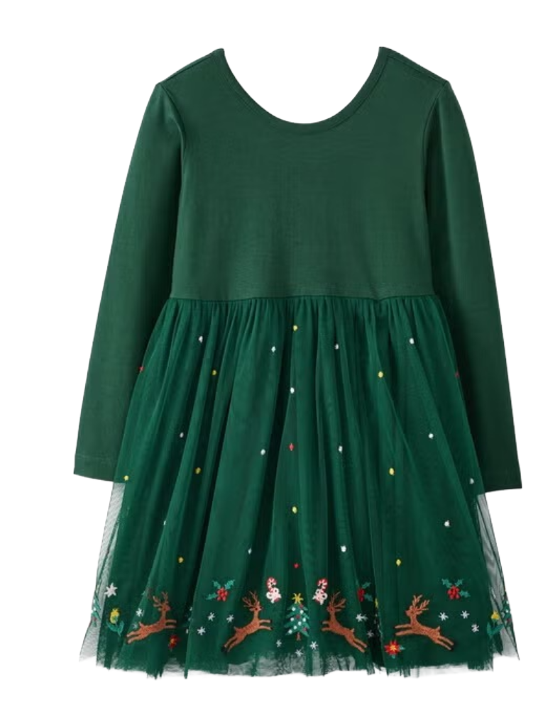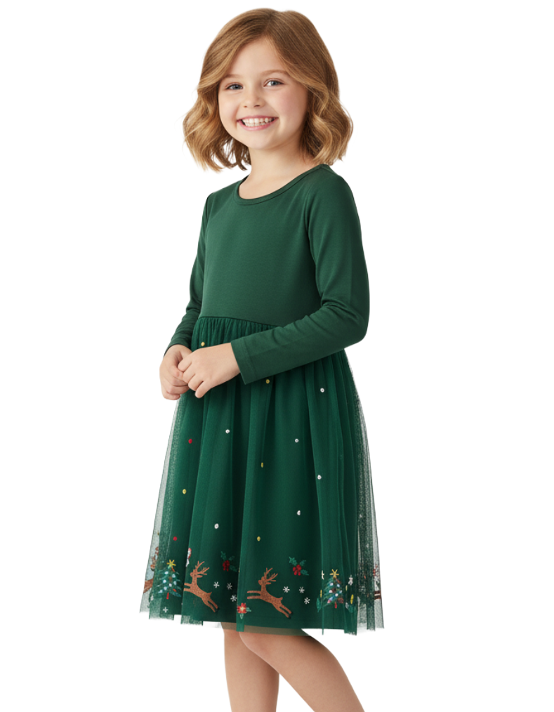 This girl's festive dress features delicate embroidery on soft forest green tulle, creating a refined and elegant look perfect for special occasions. The lightweight tulle fabric offers comfort and a graceful silhouette, while the detailed embroidery adds sophisticated charm. Ideal for holiday celebrations, this dress combines style and comfort, making it a standout choice for your child's festive wardrobe.