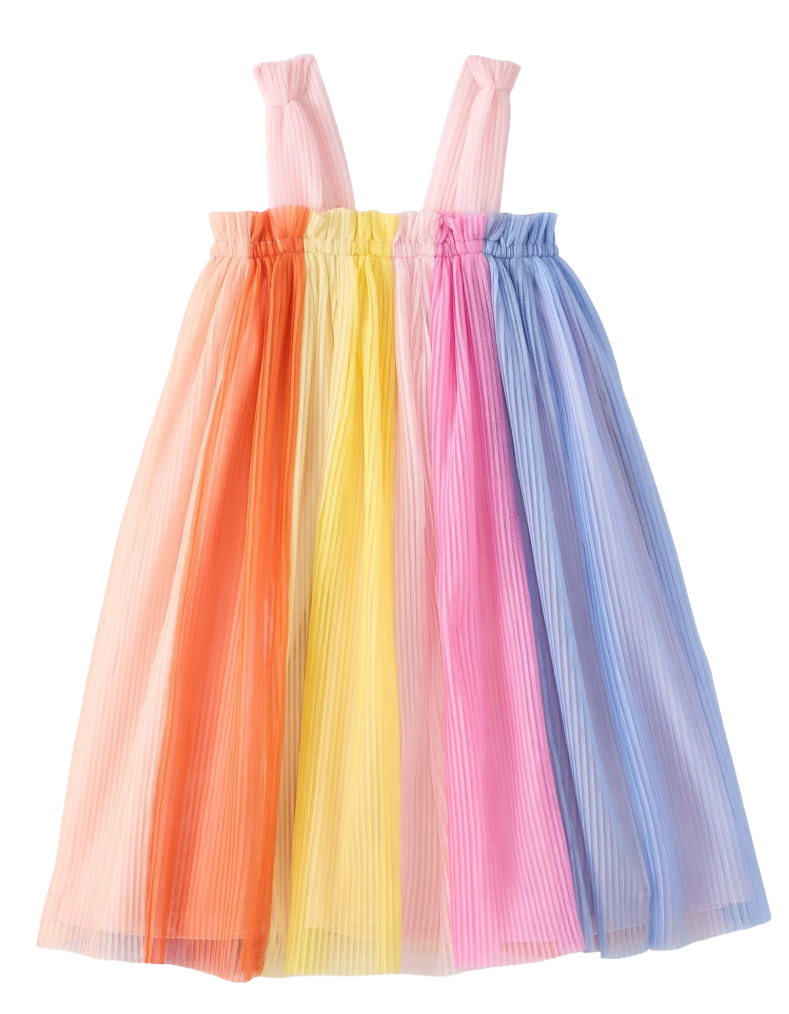 This girls' sleeveless dress features a vibrant multi-rainbow palette and an A-line silhouette for comfortable twirling. The encased elastic top hem ensures a secure fit, while the full paneled skirt with gathered sweep adds volume and playful movement. Crafted from soft, machine-washable tulle, this above-knee dress is both durable and easy to care for, making it ideal for active children and everyday wear.