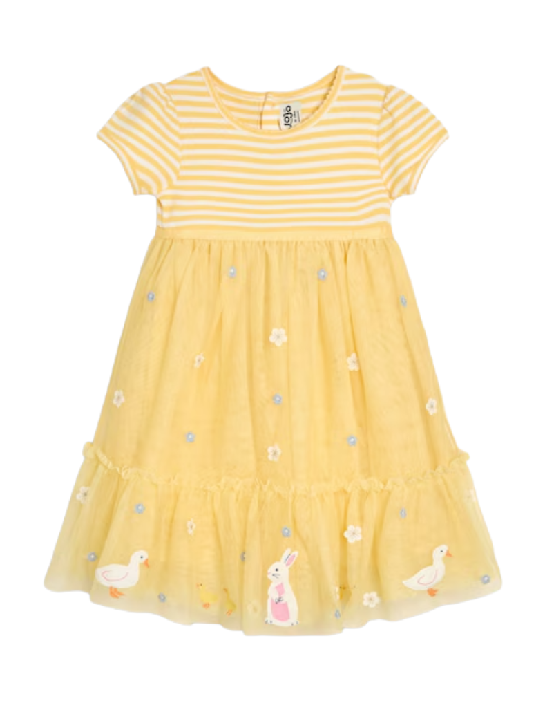 Celebrate spring in style with the JoJo Maman Girls' Appliqué Hem Tulle Party Dress in yellow. This delightful dress features a soft yellow striped short-sleeved top with a comfortable round neckline and a convenient back opening for easy dressing. The floaty tulle skirt is adorned with charming bunny and duck appliqué motifs around the hem, perfect for twirling and festive occasions. Machine washable for easy care, this dress combines playful design with practical wearability, making it a charming choice for little ones' spring celebrations and egg hunts.