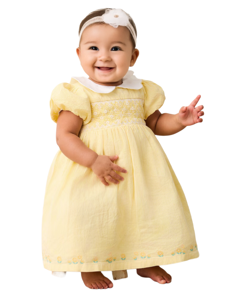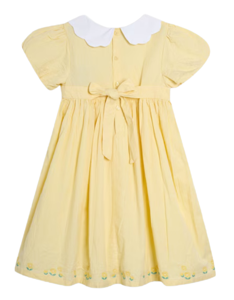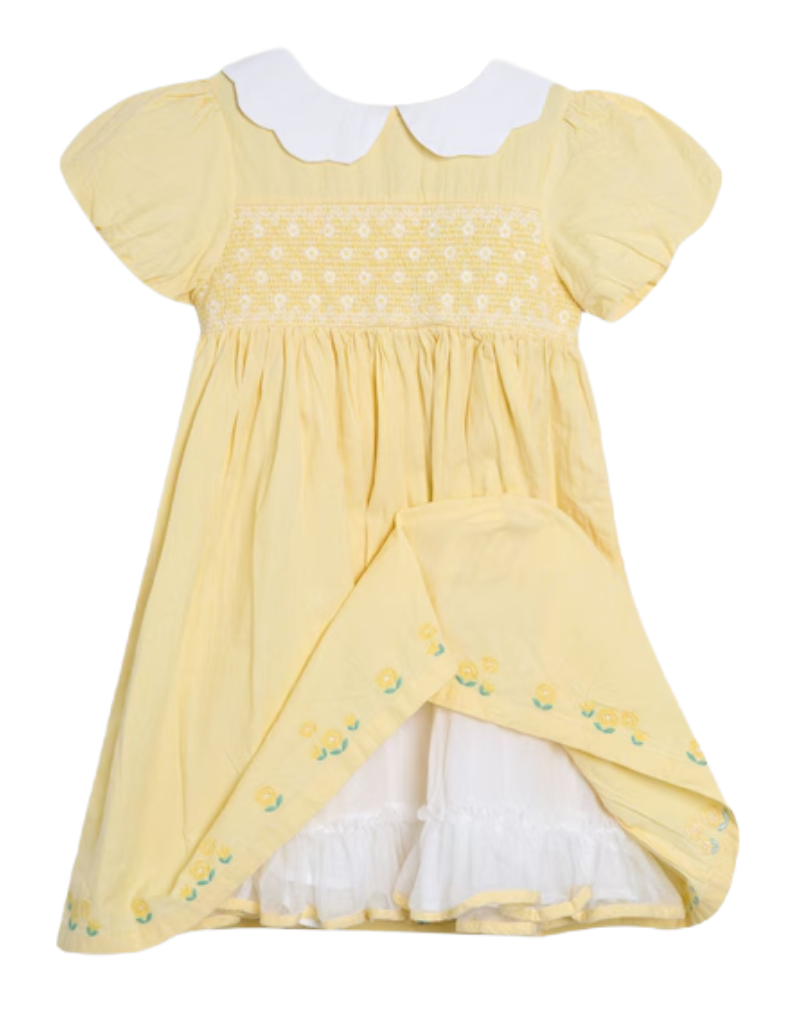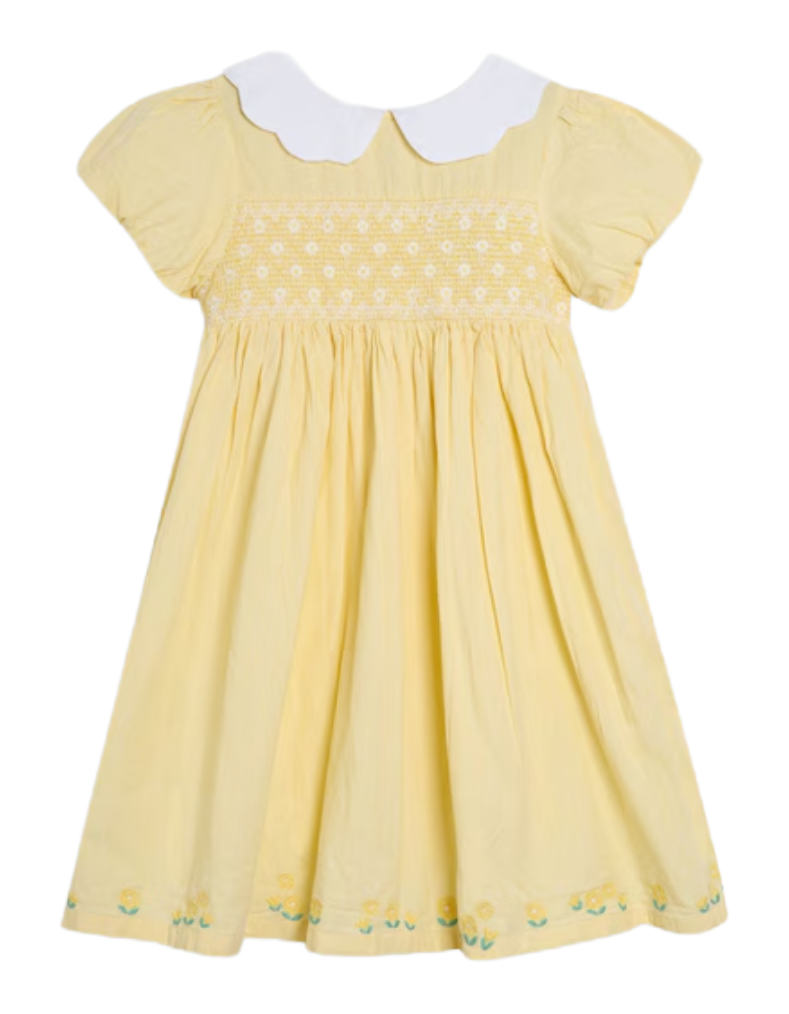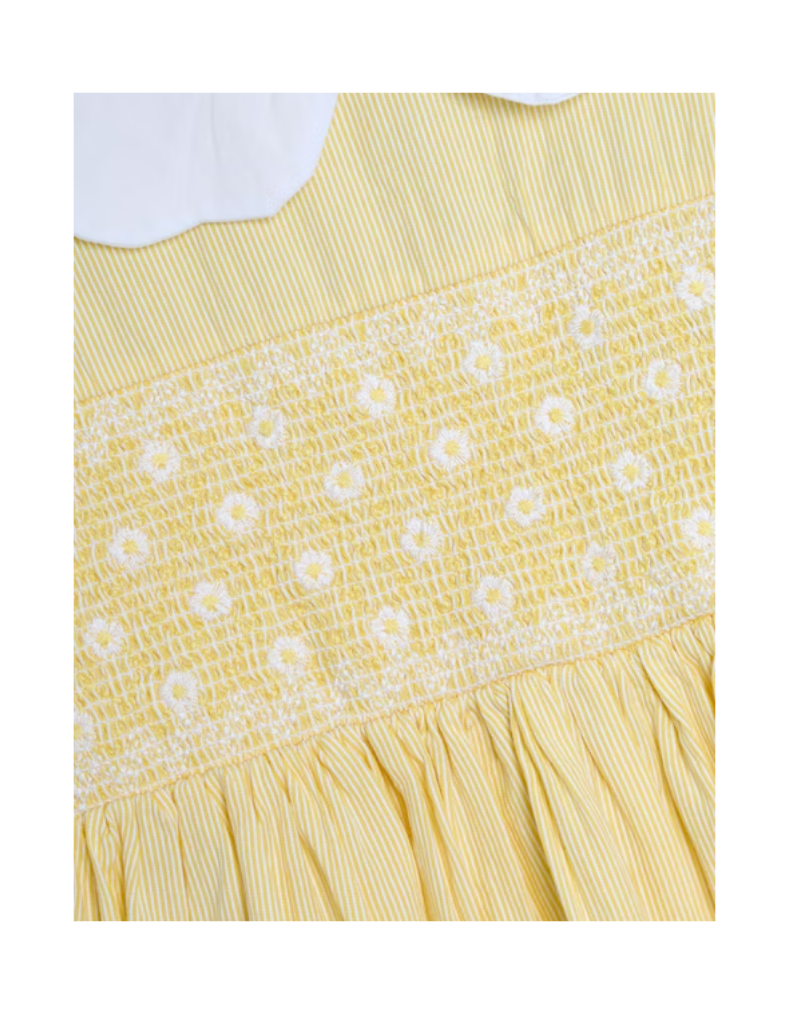 This Jojo Maman Girls' Bud Floral Embroidered Smocked Party Dress in yellow features delicate pinstripes and a vintage-inspired white scalloped Peter Pan collar. The embroidered smocked bodice and floral hem add refined, garden-themed details, while the short puffy sleeves enhance its charming silhouette. Designed for comfort and style, the dress is machine washable, combining practicality with elegance. Perfect for special occasions, it offers effortless coordination and freedom of movement.