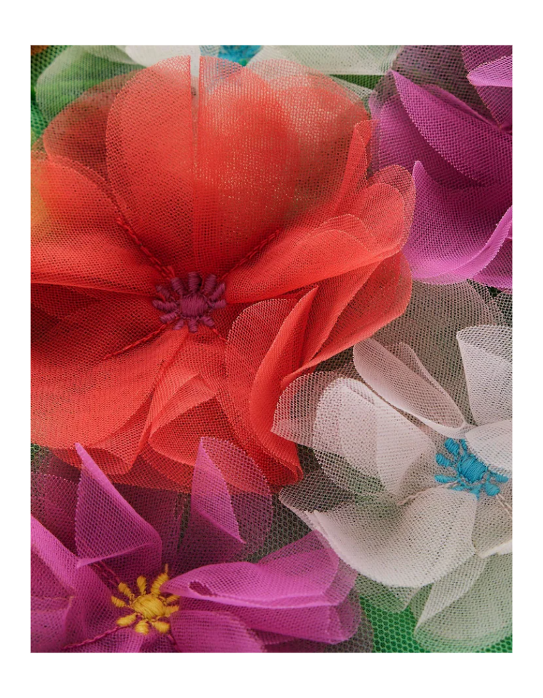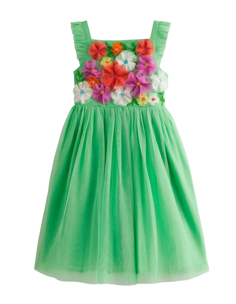 This Mini Boden Girls' Floral Applique Tulle Dress in Green features a full gathered skirt adorned with delicate appliqué flowers that move gracefully. Designed with a flattering square neckline and flutter straps, it ensures a charming silhouette, while the shirred back panel offers a comfortable fit. Practical and stylish, this dress is machine washable for easy care.