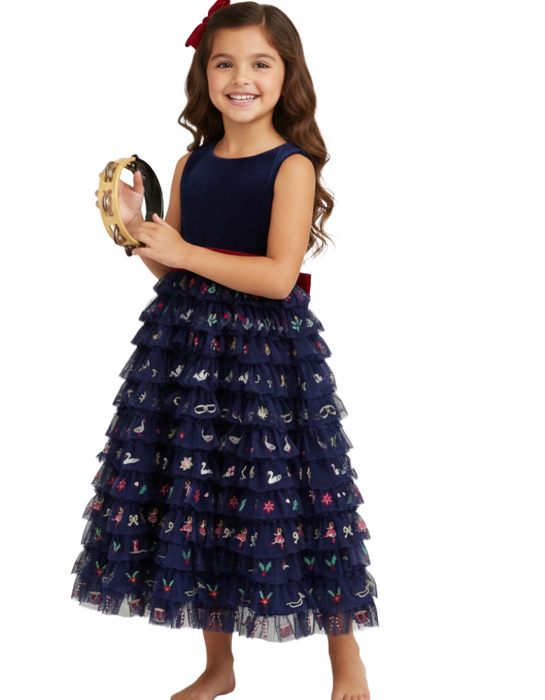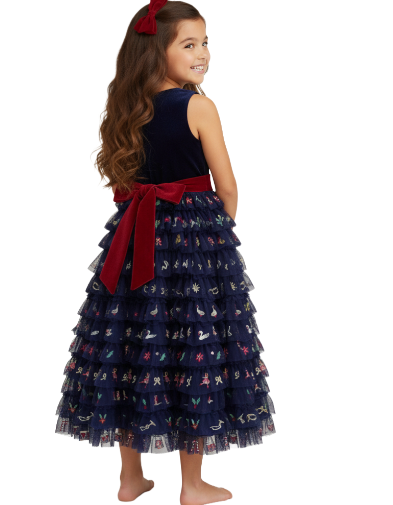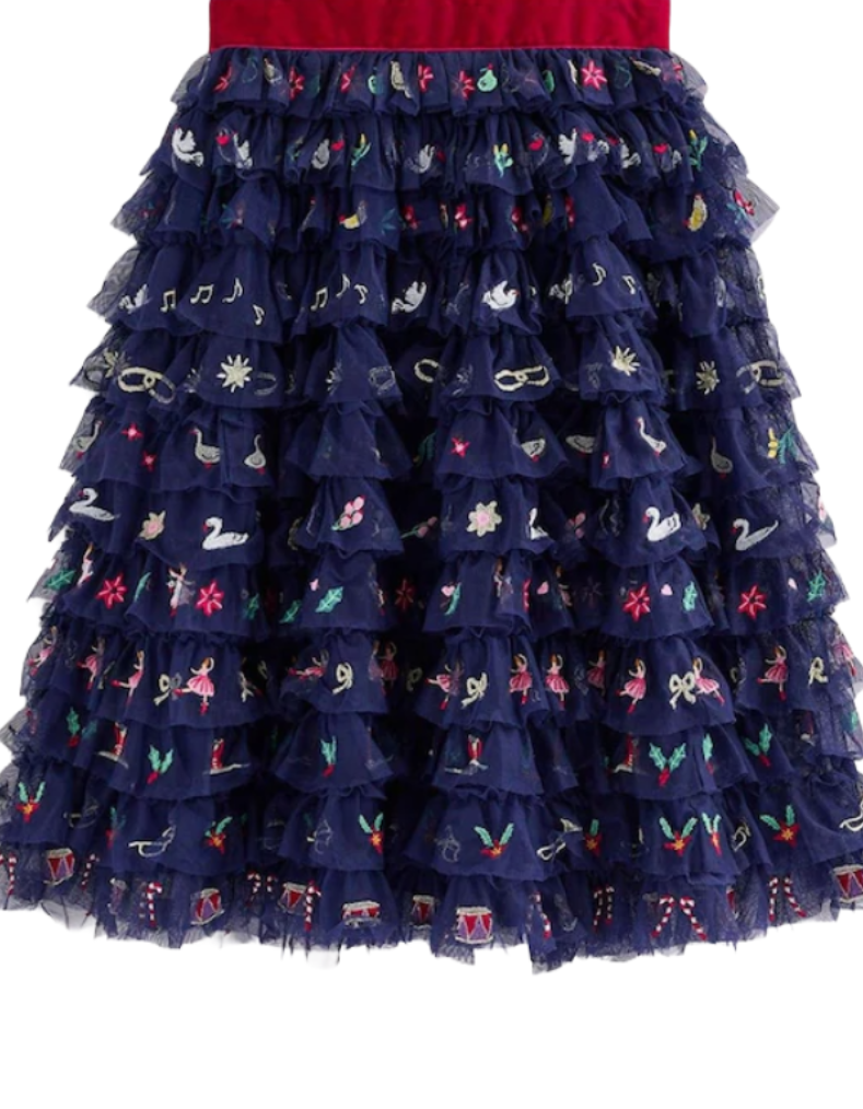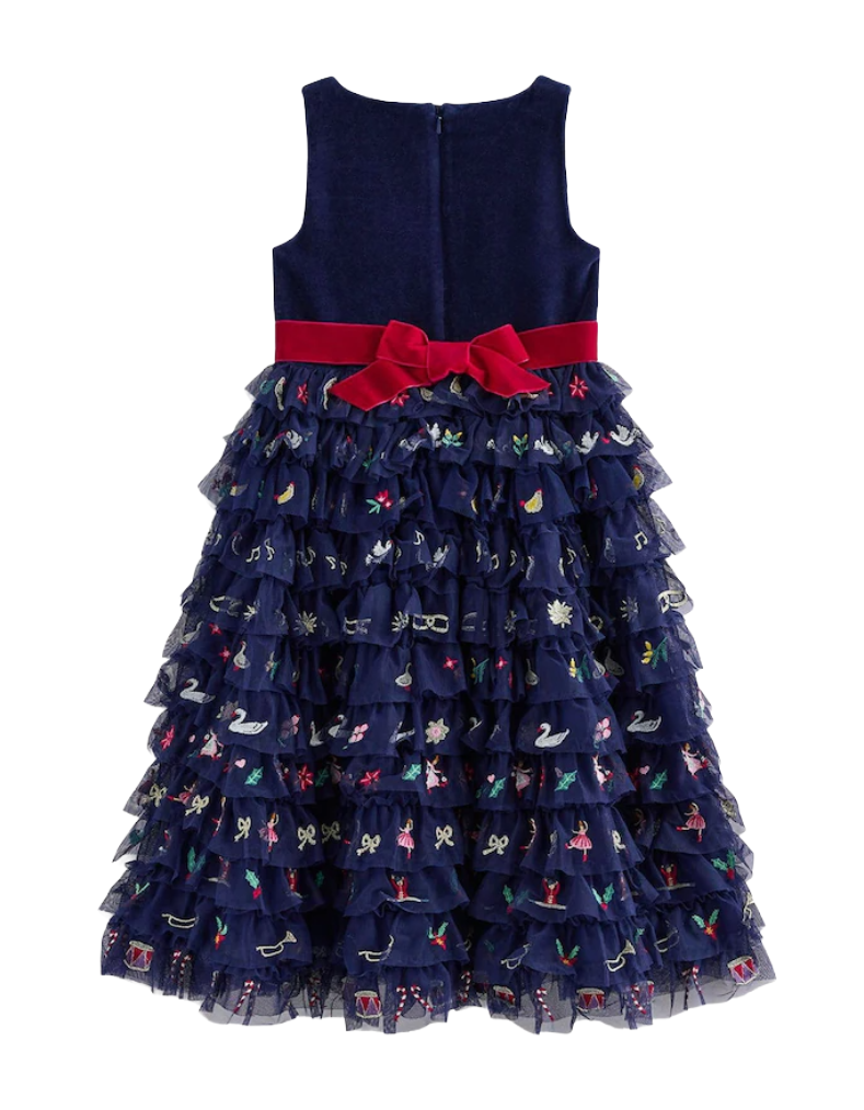 Celebrate the festive season in Boden’s 12 Days of Christmas dress, crafted with expert detail. Its tulle skirt features delicate embroidery of the classic carol’s gifts on each layer, offering a unique seasonal charm. The dress is completed with a luxurious velvet bodice and a striking red bow, combining elegance with holiday spirit. Made entirely from polyester for comfort and durability, this dress is a refined choice for memorable festive occasions.