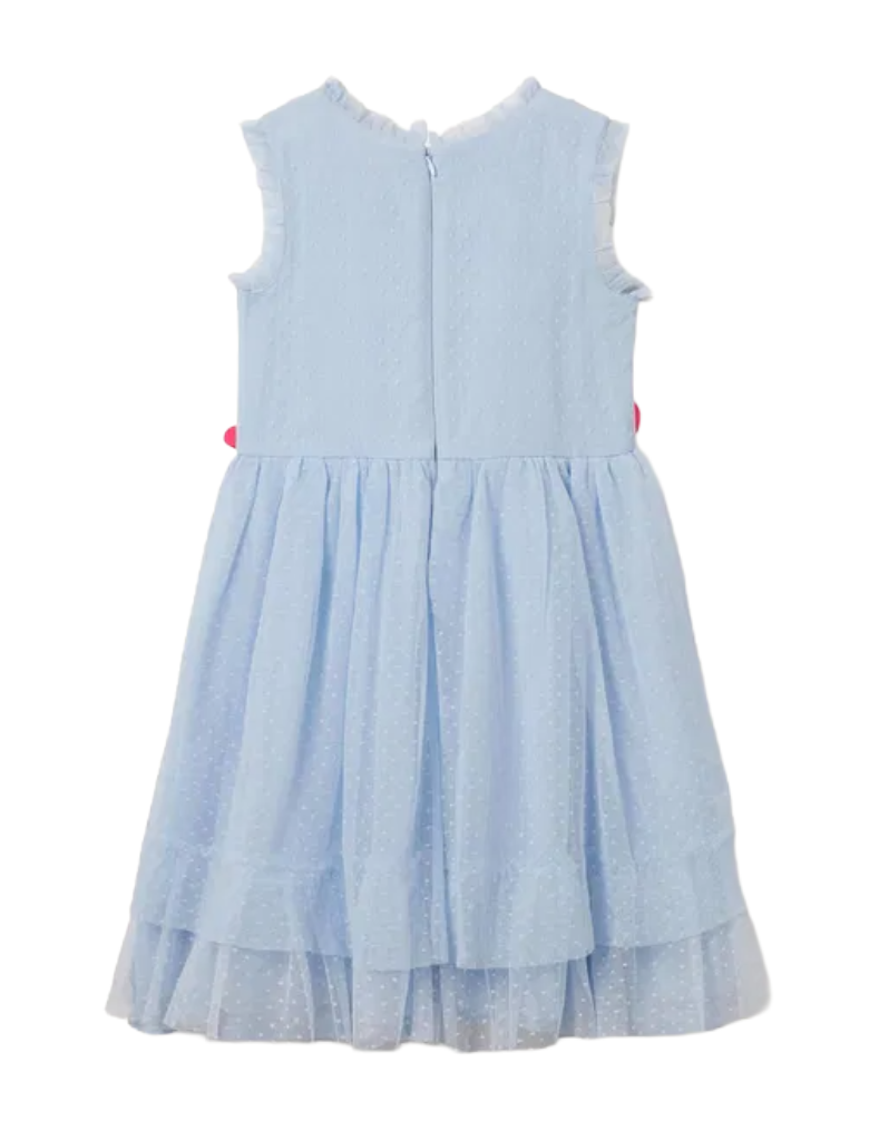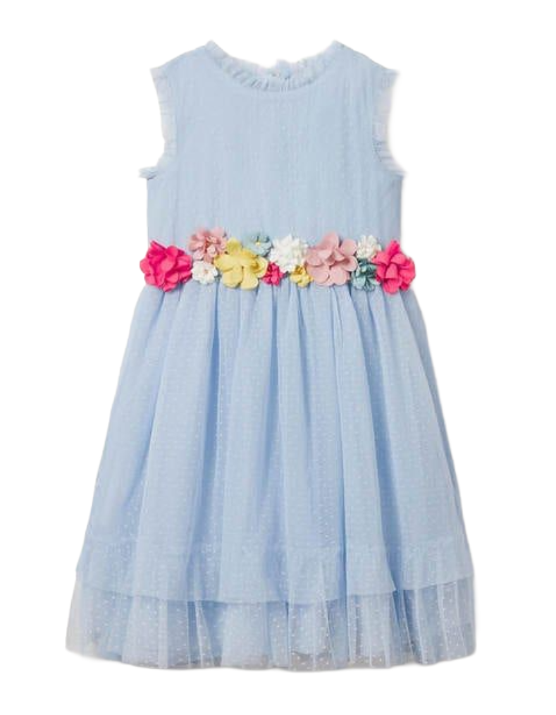 This floral corsage dress features detailed flower appliqué at the waist and two layers of tulle that spin and flutter gracefully. Enhanced by a net underlayer and spotted overlay, it offers added volume and movement. Fully lined to ensure comfort, it’s ideal for an entire day of active wear.