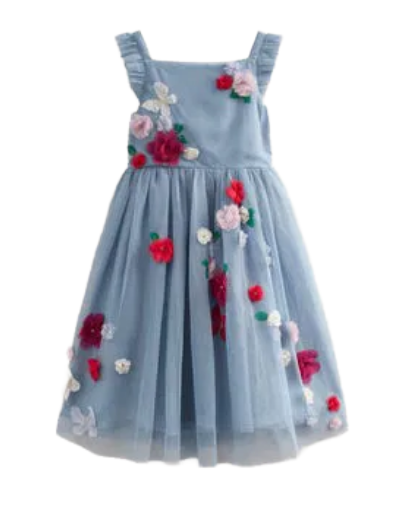 This Mini Boden girls' dress in pastel blue features a gathered full tulle skirt adorned with delicate appliqué flowers that add graceful movement. The design includes a flattering square neckline and flutter straps for a charming silhouette, while the shirred back panel ensures a comfortable, secure fit. Ideal for special occasions, this dress combines elegant details with comfort for lasting wear.