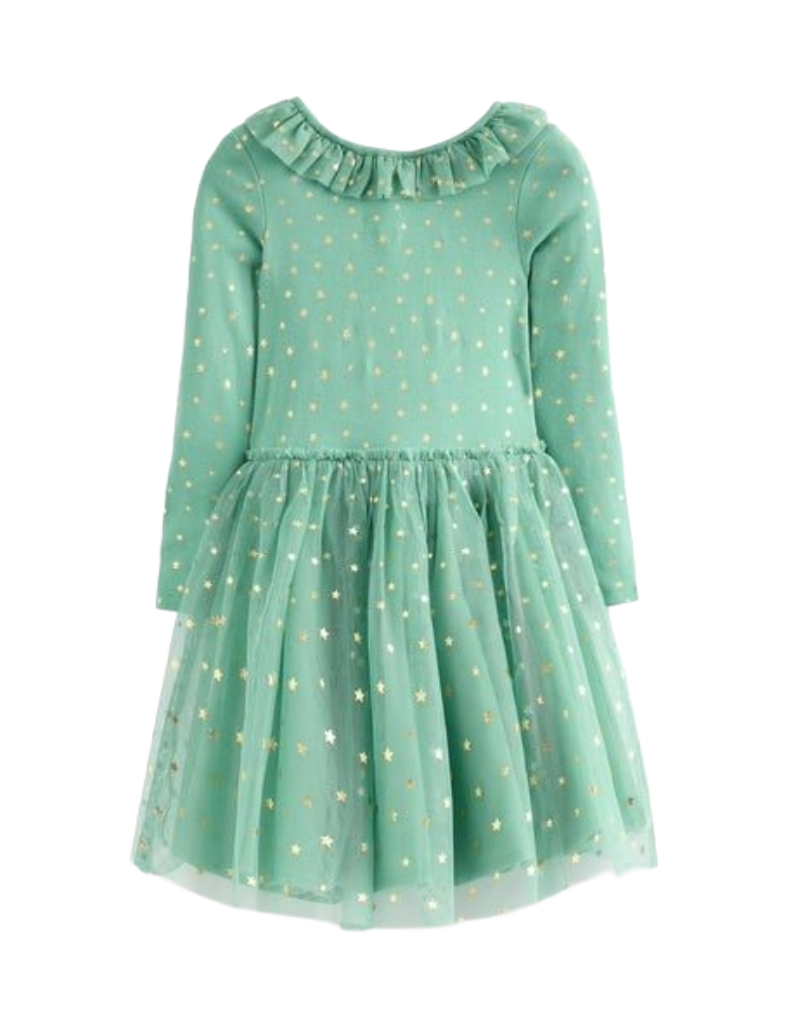 This Mini Boden dress combines playful layers of soft tulle with a sparkling green star pattern, creating an enchanting party look. The delicate ruffly collar adds a charming touch, while the twirl-ready silhouette ensures easy movement and dancing comfort. Perfect for celebrations, this dress blends style and comfort seamlessly.