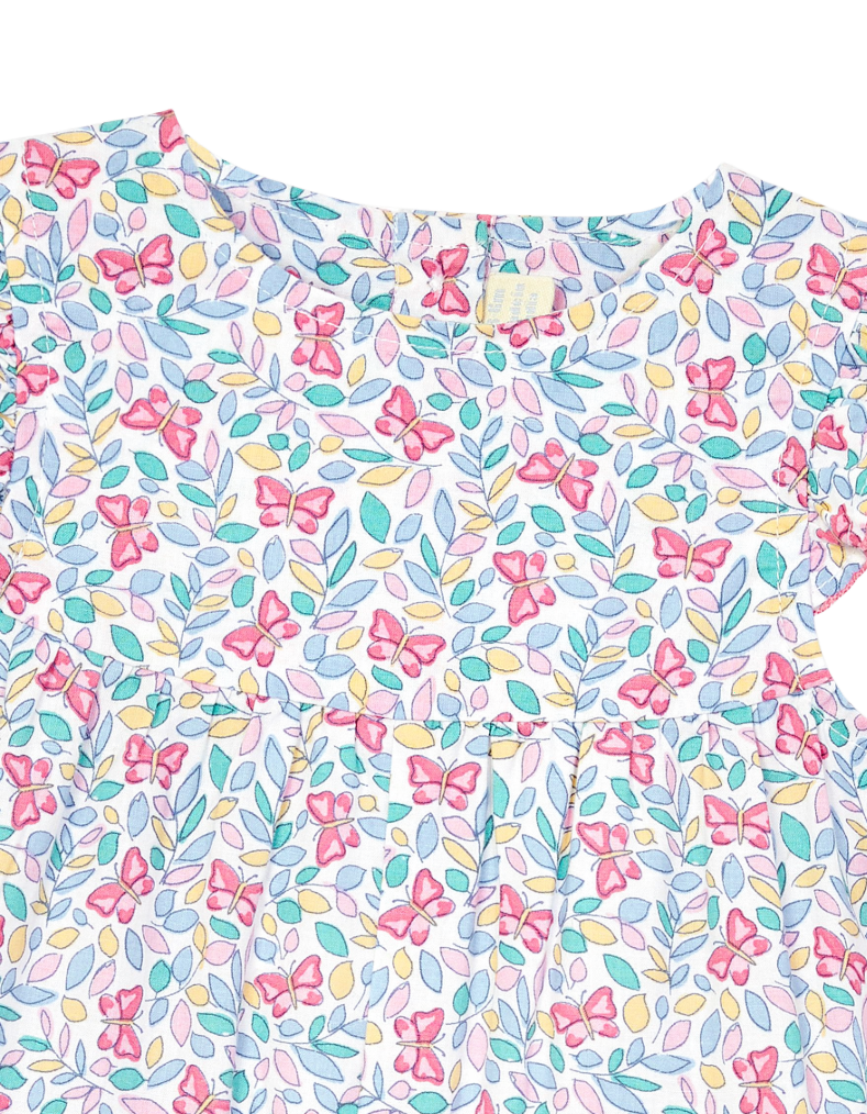Keep little ones comfortable and protected during sunny days with this charming cotton sunsuit. Featuring an all-over butterfly print and decorative appliqué butterfly pockets, it combines playful style with practical functionality. The ruffle sleeves add a delicate touch, while the button-back fastening and leg poppers make dressing effortless for busy parents. The all-in-one design offers versatility for warmer weather, ensuring your child stays cool and content from morning to evening.