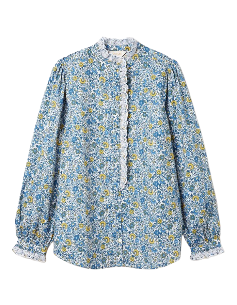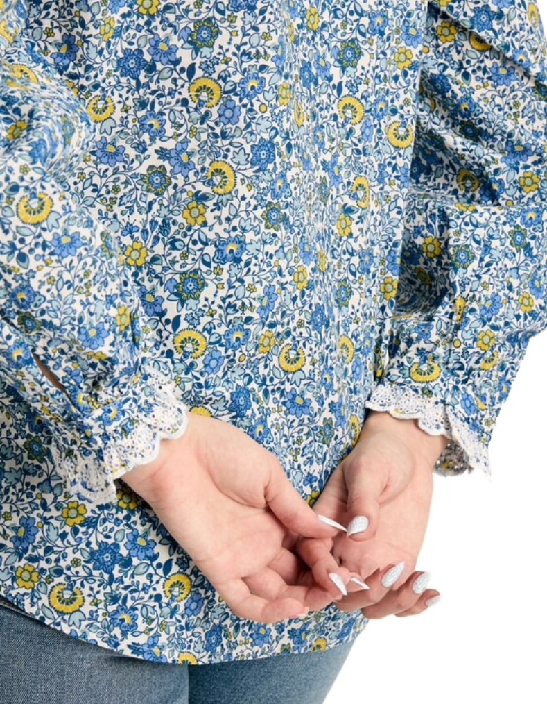 The Women's Floral Print Valentina Broderie Trim Blouse in Blue/White features delicate frilled broderie trimming the placket, neck, and cuffs, elevating its classic silhouette. Crafted from 100% cotton, it ensures breathability and comfort in warm weather. Design details include a fabric button front, gathered shoulders for subtle volume, and long sleeves with buttoned cuffs finished with broderie trim. This elegant blouse pairs effortlessly with jeans or chinos, making it a versatile wardrobe staple. Please note, this item is sold as imperfect.