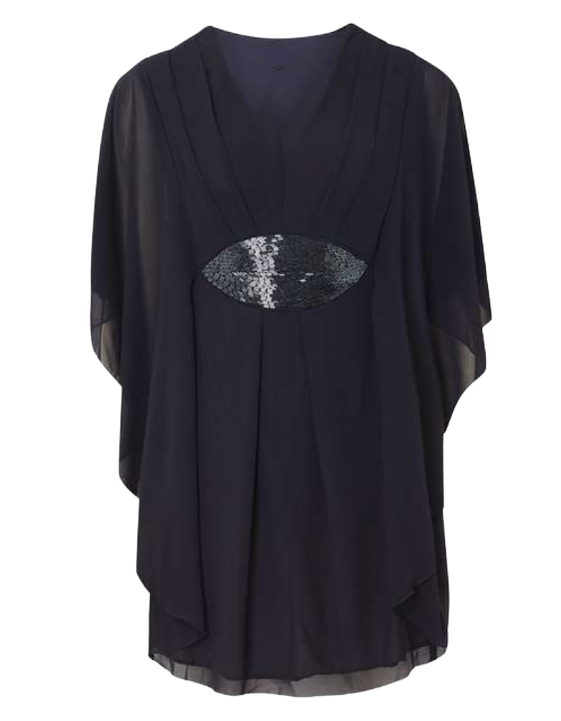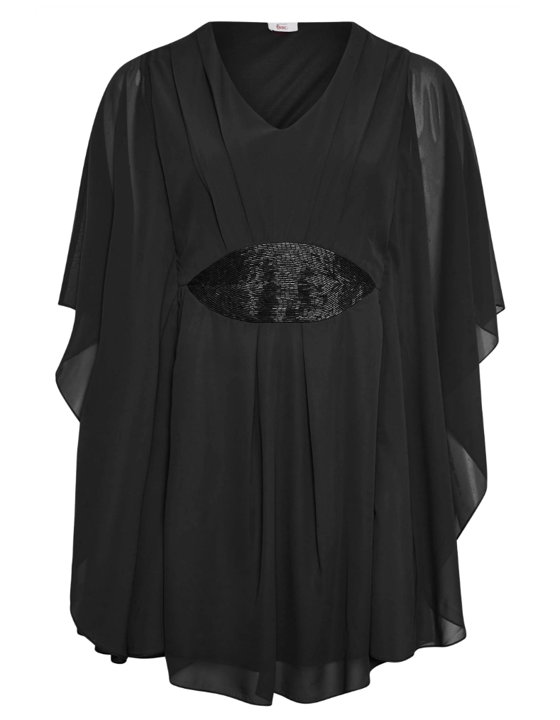Elevate your evening wardrobe with this exclusive Women's Hand Embellished Waist Cape Top in Black. Crafted from soft woven fabric, it features intricate hand embellishments at the waist, a flattering V-neckline, and a delicately pleated front, blending sophistication with subtle drama. Pair it with tailored jeans and heels for a polished look that transitions effortlessly from day to night. Please note, this item is sold as imperfect, making it a unique addition to your collection.