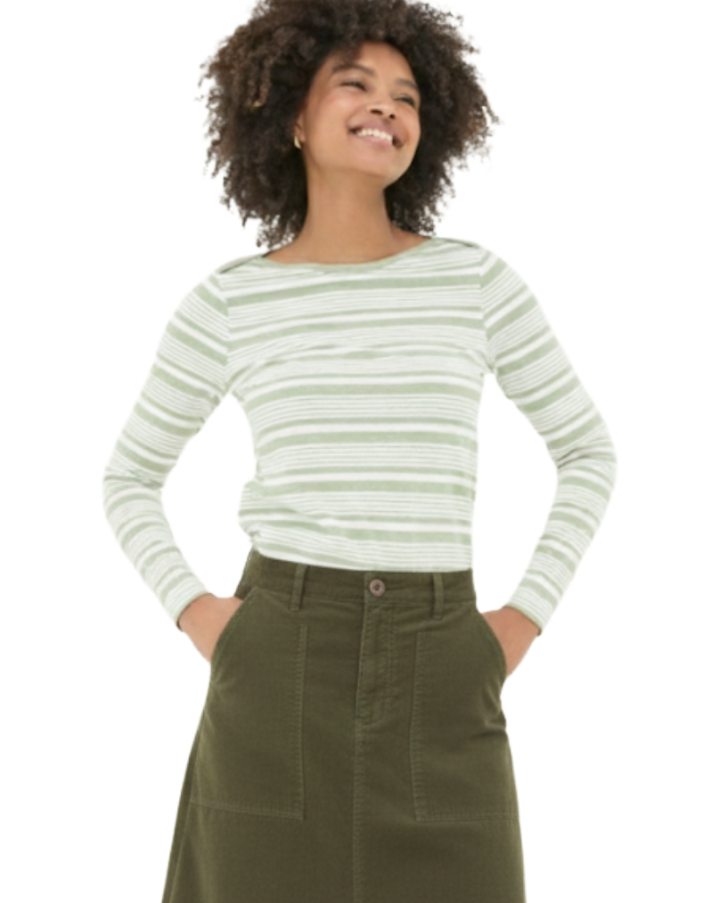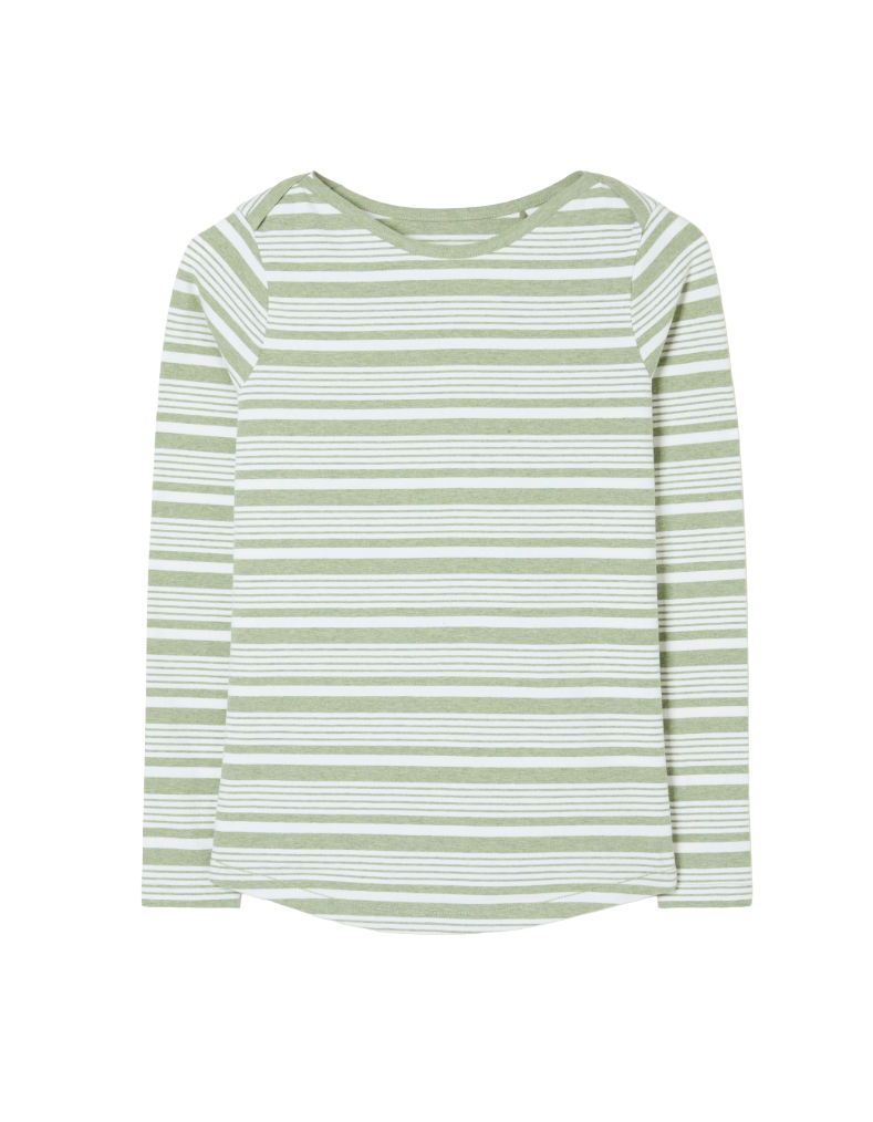 The Women's Long Sleeve Cotton Breton T-Shirt in Sage Green combines timeless style with everyday comfort. Crafted from supersoft cotton with a touch of stretch, this staple piece ensures a flattering fit and a gentle feel against the skin. Its muted sage green hue offers versatile pairing options, making it a reliable foundation for any wardrobe. Designed for durability while maintaining breathability, this Breton T-shirt elevates casual dressing with an expert touch.