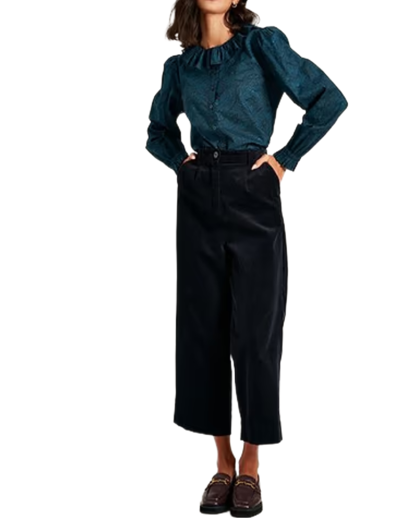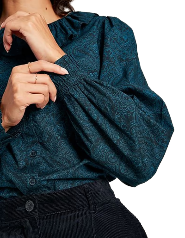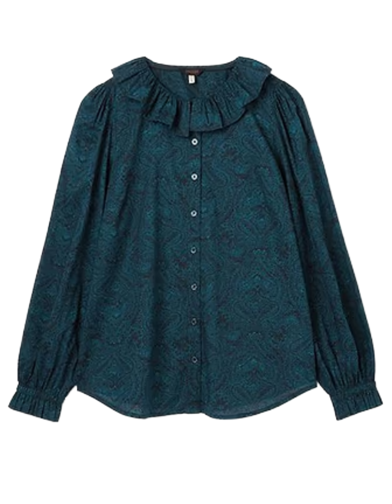 Light and elegant, the Women's Long Sleeve Fallon Waterfall Blouse in Navy Paisley is crafted from breathable cotton voile for comfortable wear. Its distinctive frilled collar cascades softly across the chest, complemented by gathered detailing at the sleeves, back yoke, and cuffs. The loose-fitting balloon sleeves end in cuffed wrists, while the curved hemline ensures a flattering silhouette. This button-down blouse balances feminine charm with expert tailoring, making it a refined choice for your seasonal wardrobe.